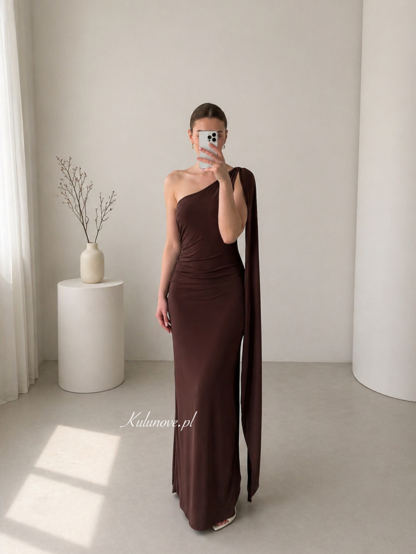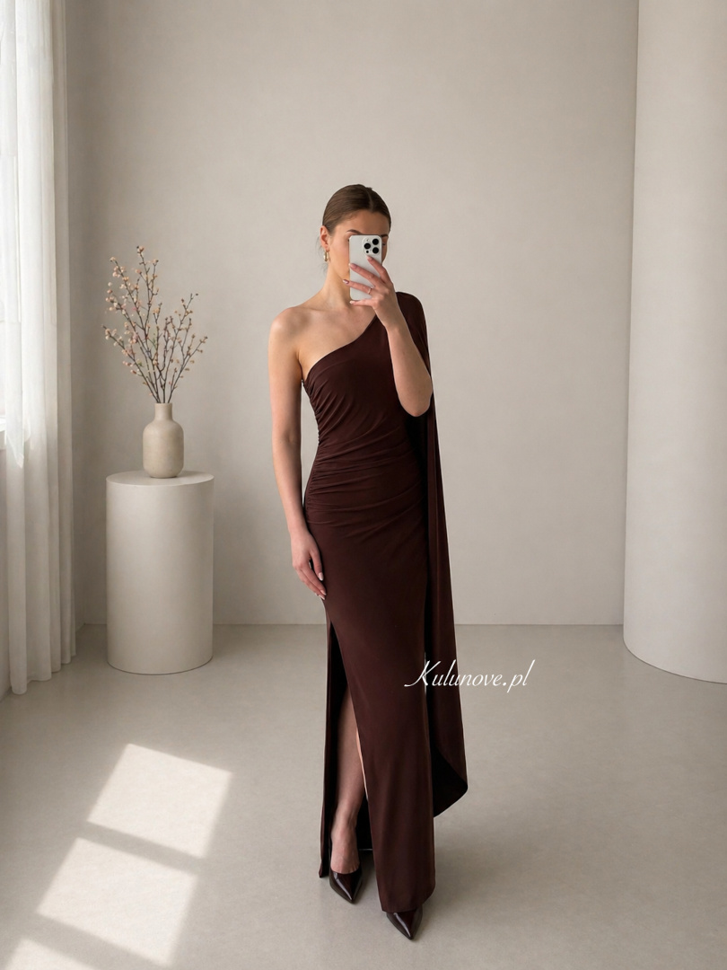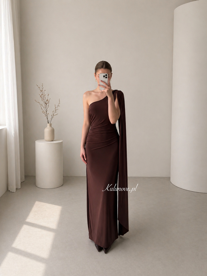The dress in a deep chocolate shade was sewn from elastic, pleasant to the touch material, which subtly adapts to the silhouette, emphasizing its assets.
