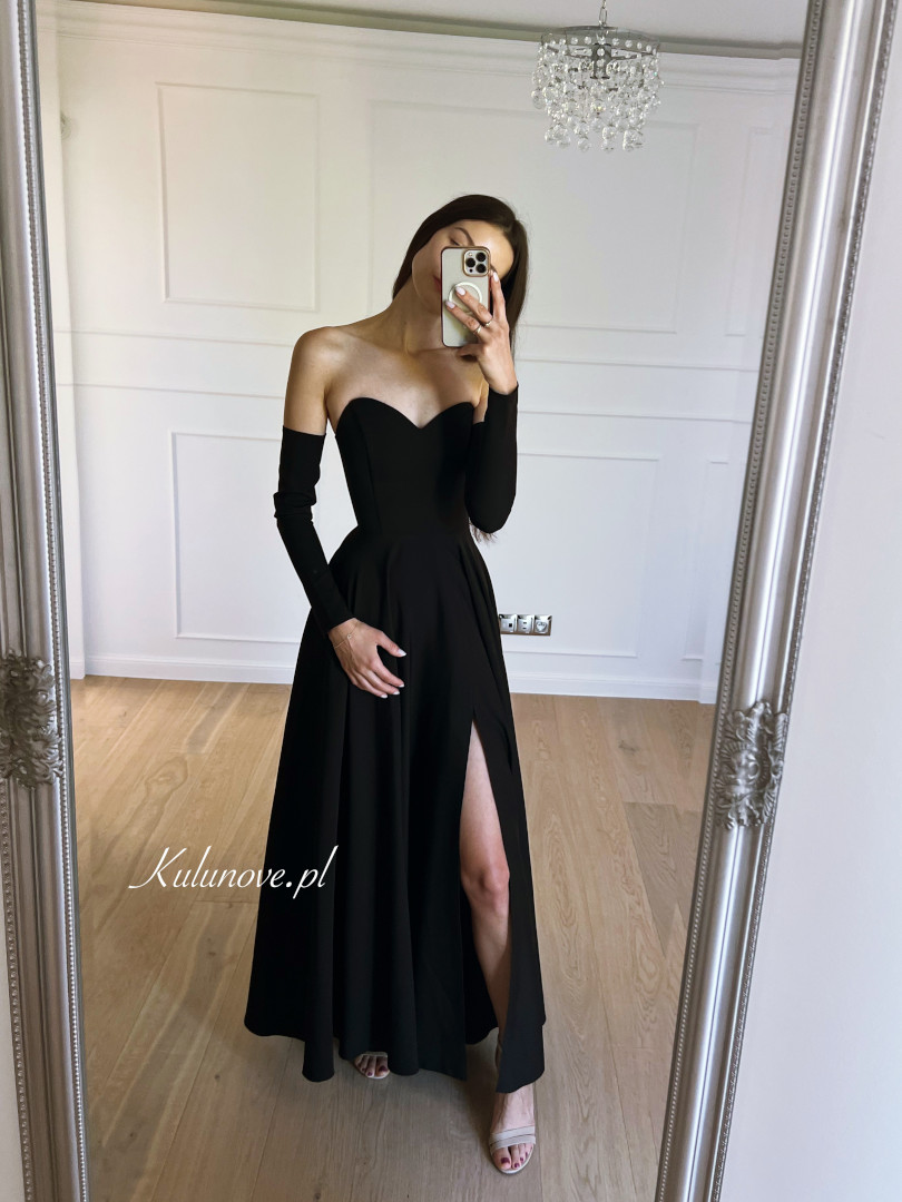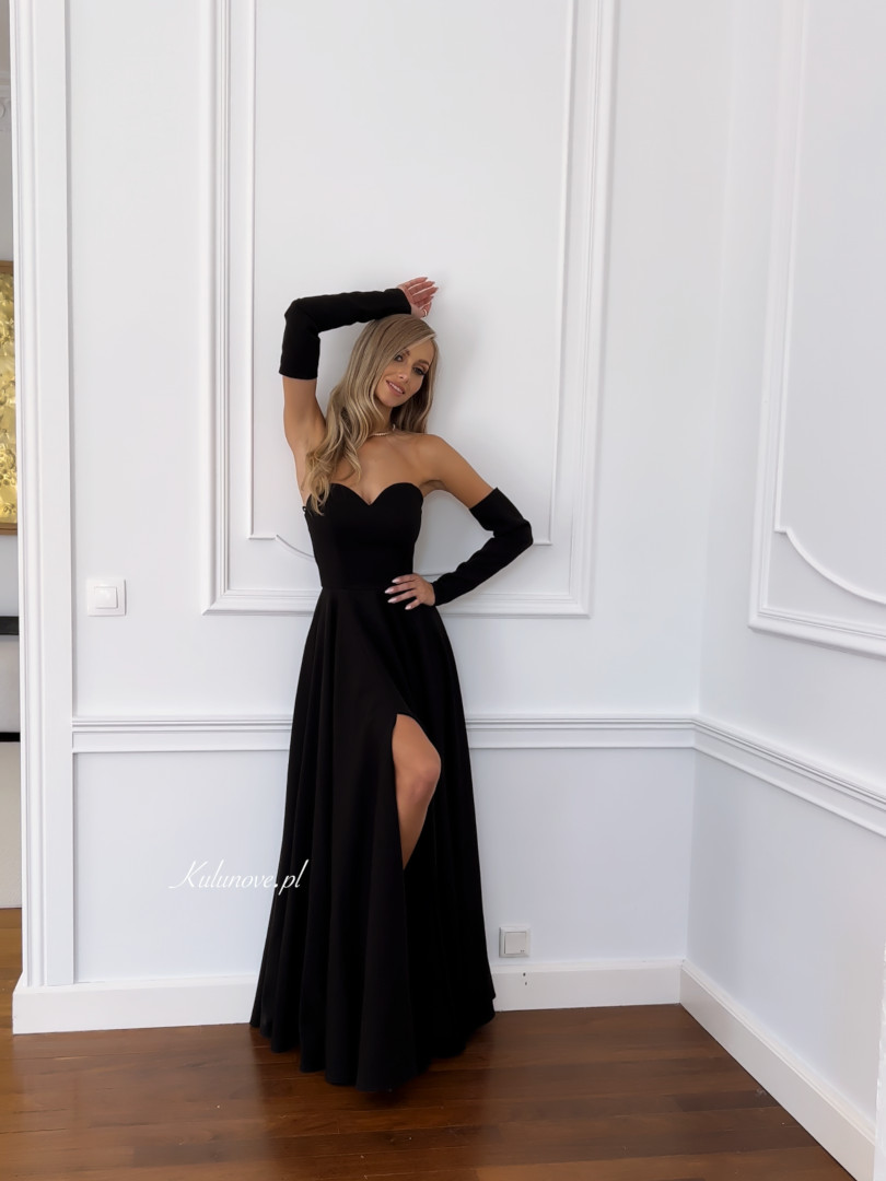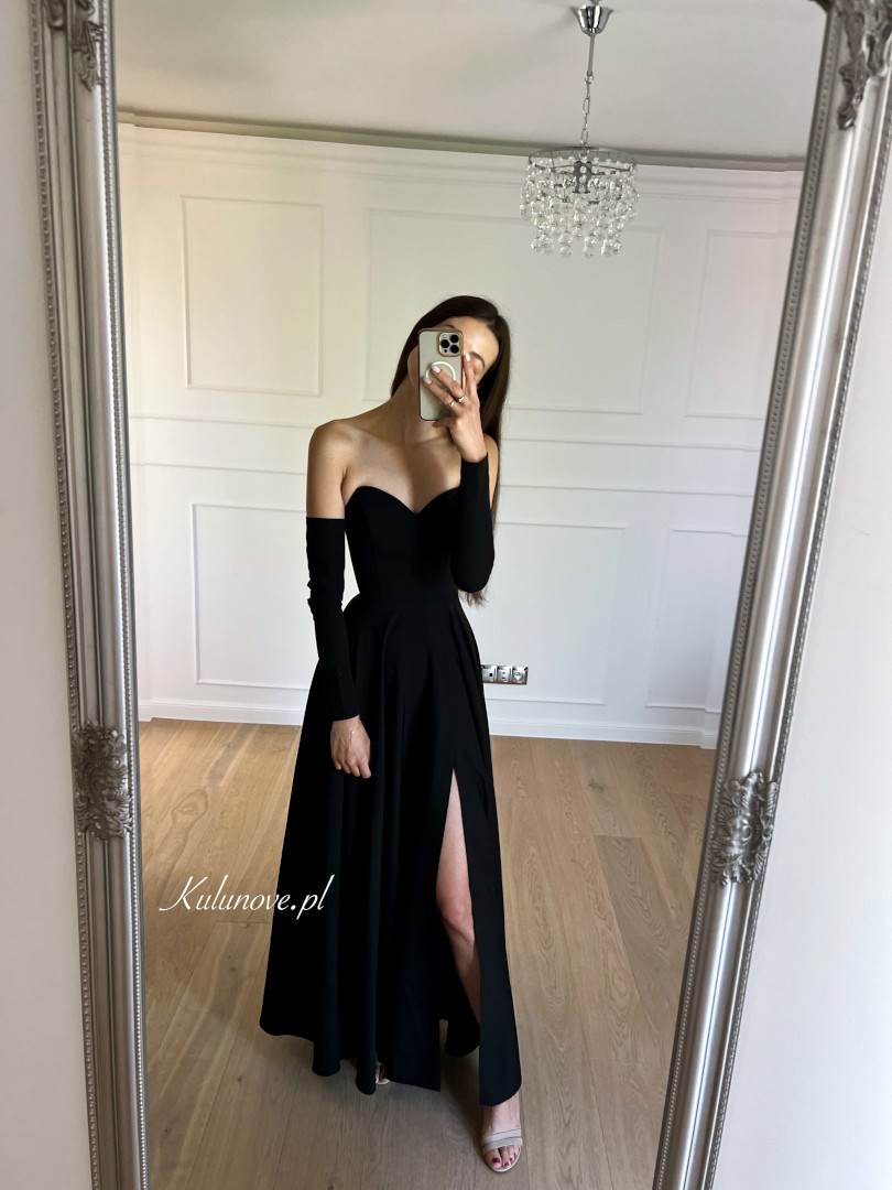 A flared, minimalist, long gown in black.