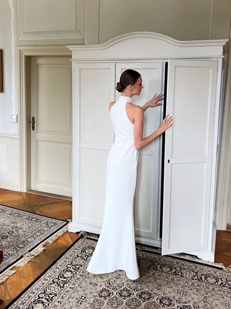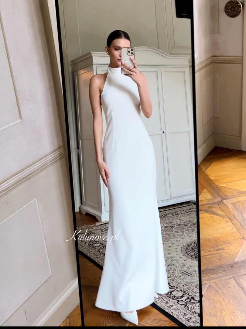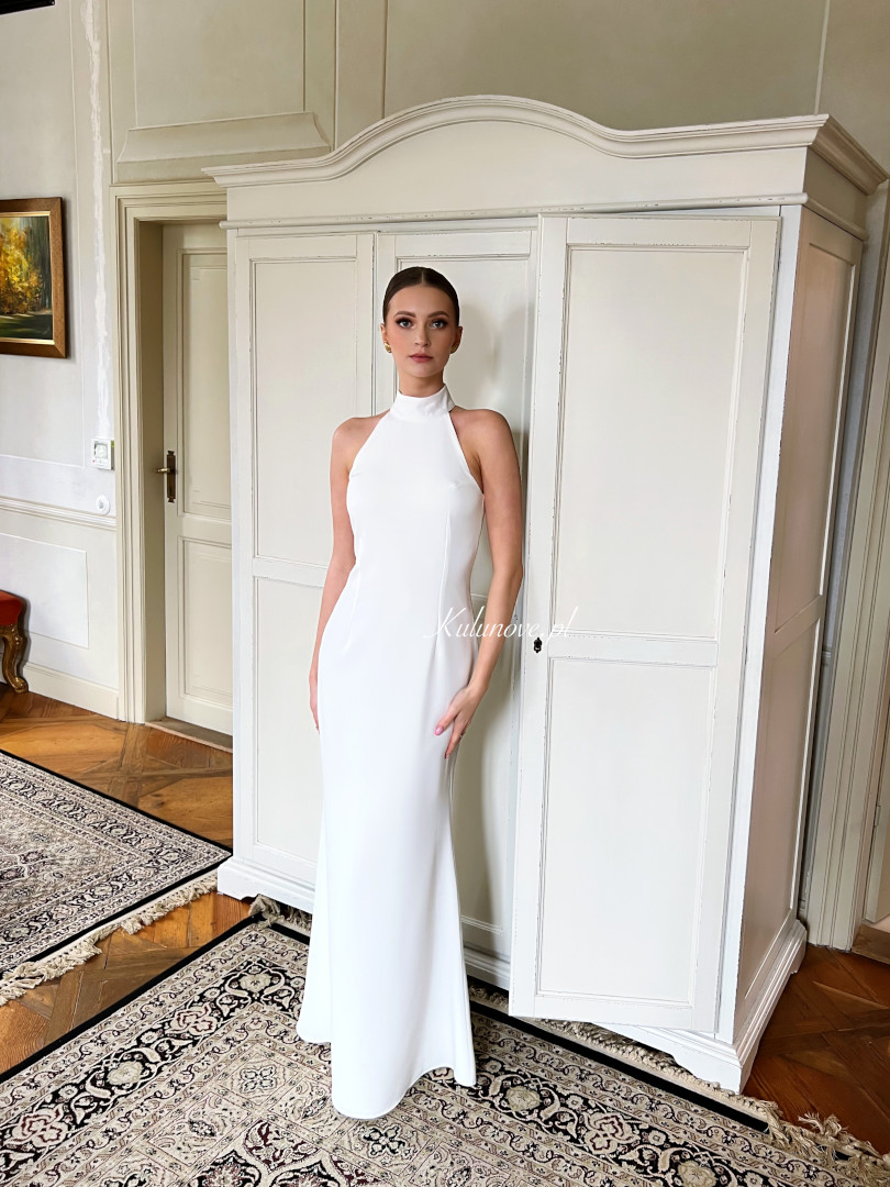 Simple fish dress in ecru color with halter neckline, without decorations.