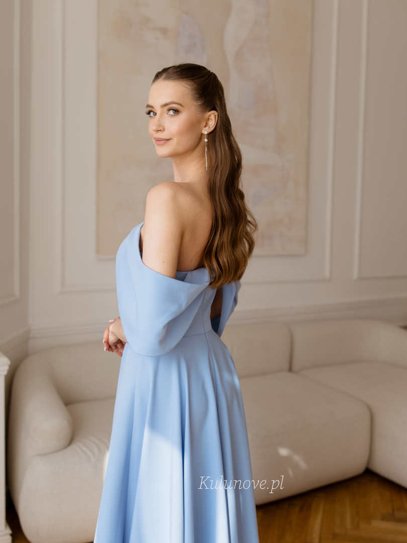 The corset top beautifully shapes the silhouette, and the detail in the form of drooping sleeves subtly exposes the shoulders.