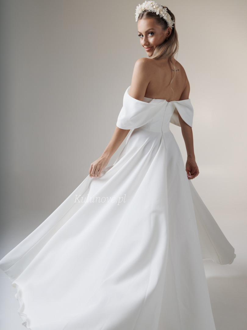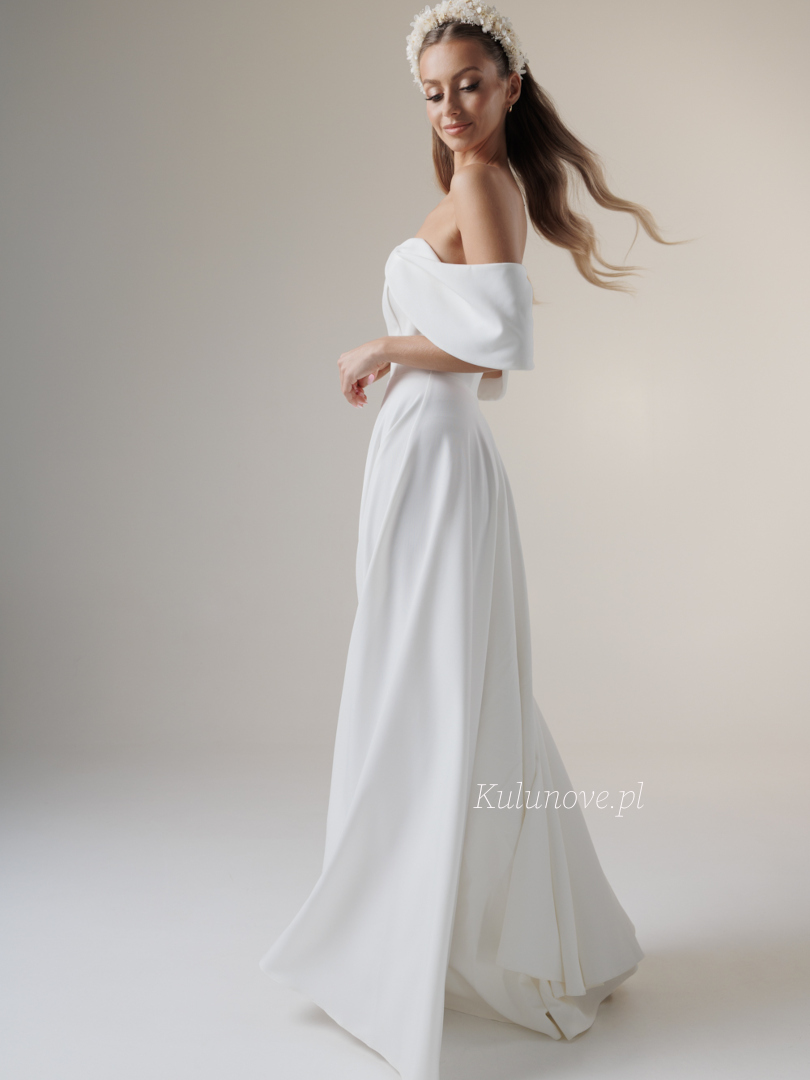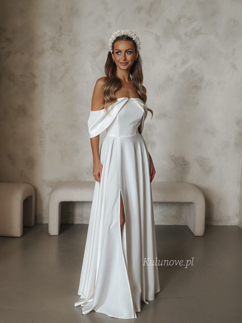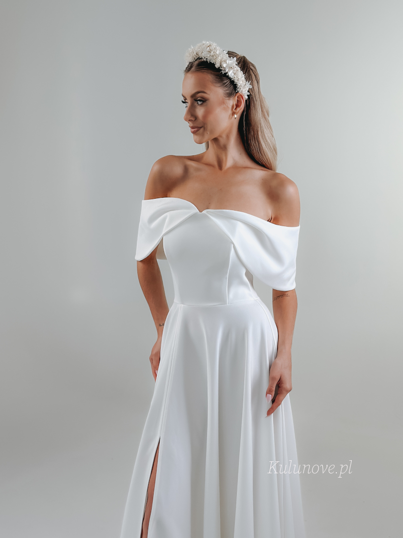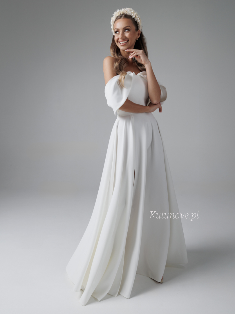 Abby - long ecru wedding dress with Spanish style neckline with leg slit.