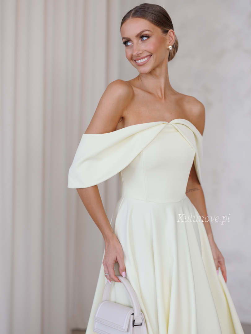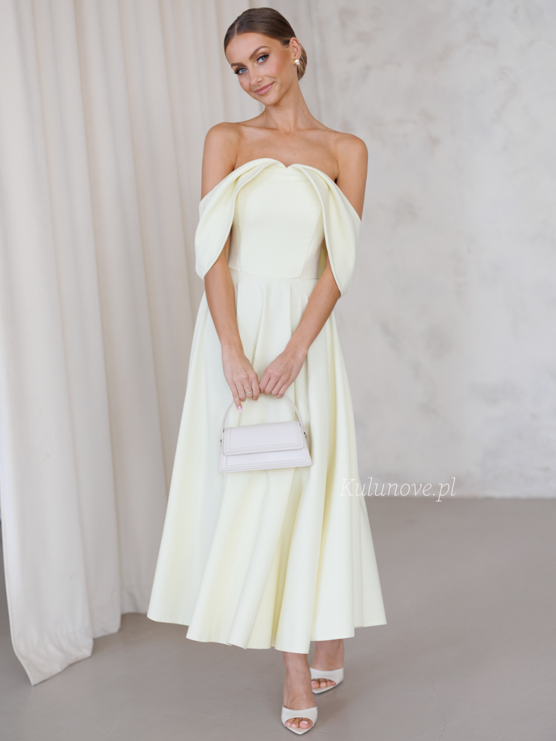 Its dropped shoulders and flared midi cut create a feminine, romantic silhouette perfect for a civil wedding, reception or other special occasions.