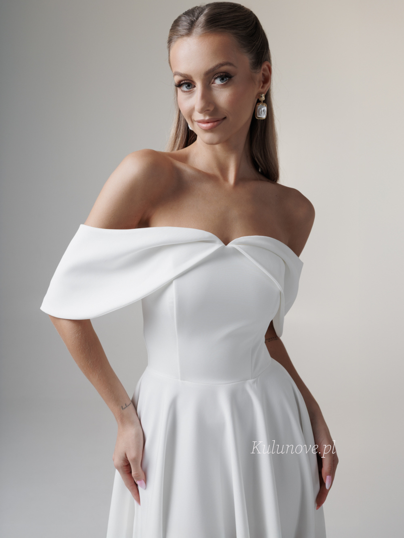The dress has an elegant, classic midi cut with open shoulders and a wide, set-in collar that subtly accentuates the neckline.