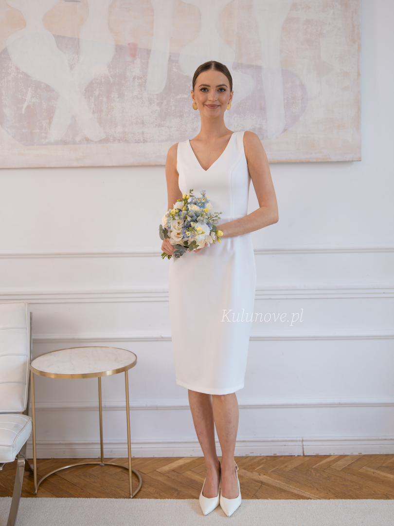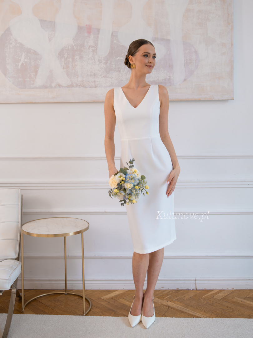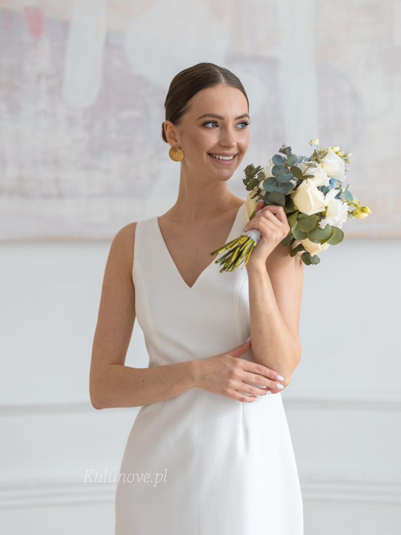 The V-shaped neckline subtly elongates the neck and slims the upper part of the silhouette, and the wide shoulder straps provide comfort and an elegant finish. The smooth fabric sits perfectly on the body, creating a timeless base for many looks - both wedding and formal.