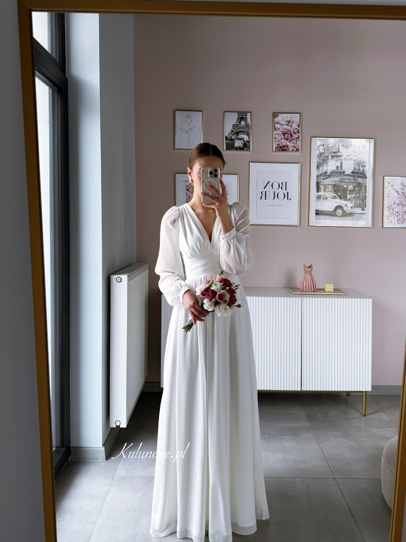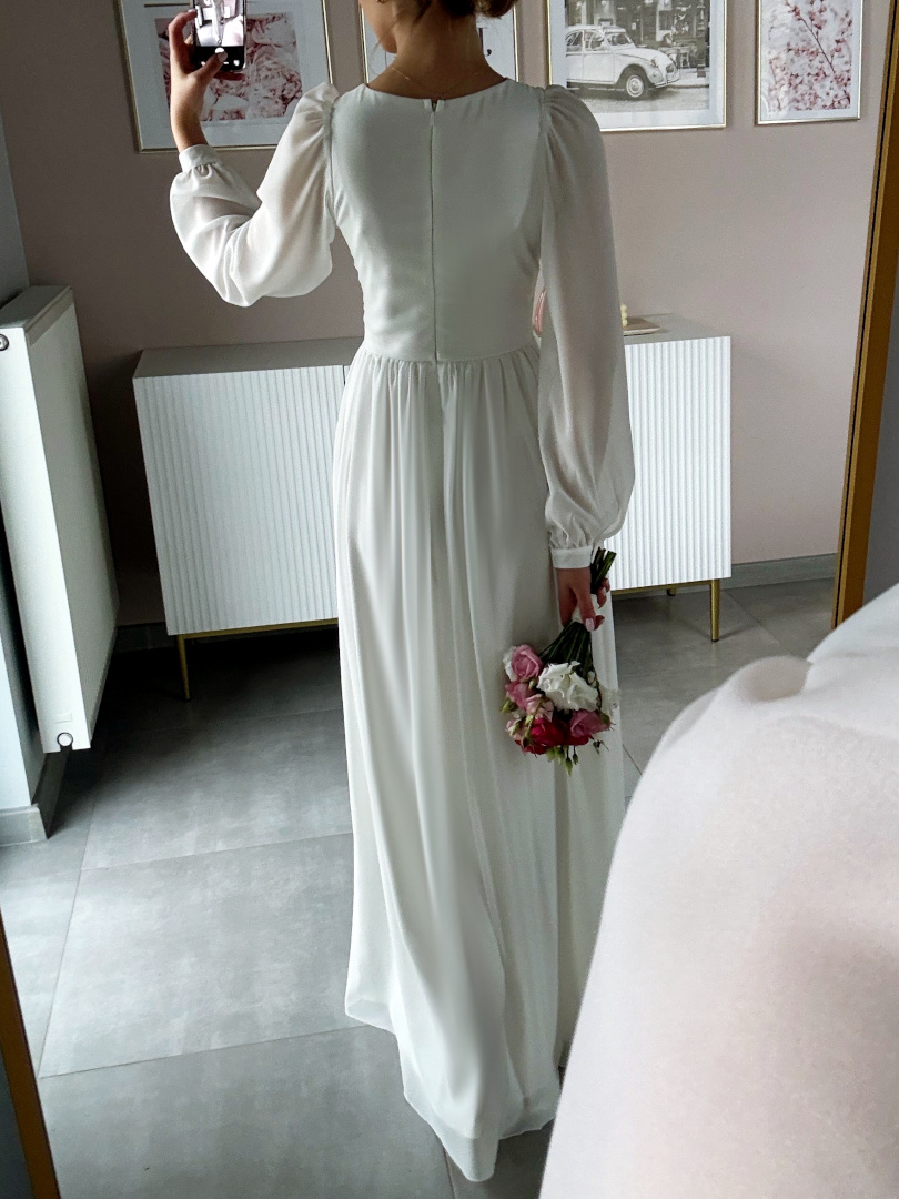 Long, simple dress with chiffon, buffet sleeves.