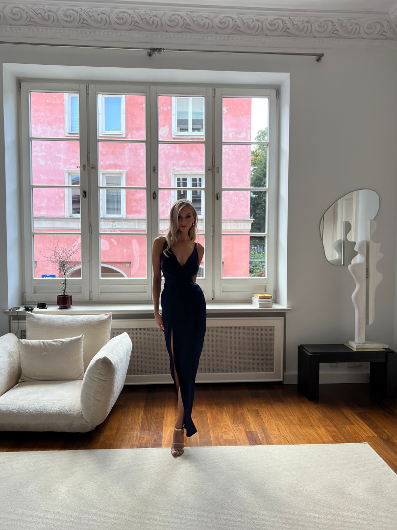 Andrea navy blue - long chic fitted dress with overlap neckline on thin straps
