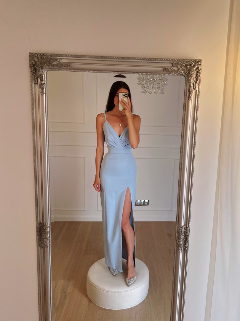 Andrea - very simple elegant maxi dress with overlap neckline in blue color