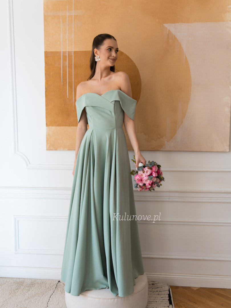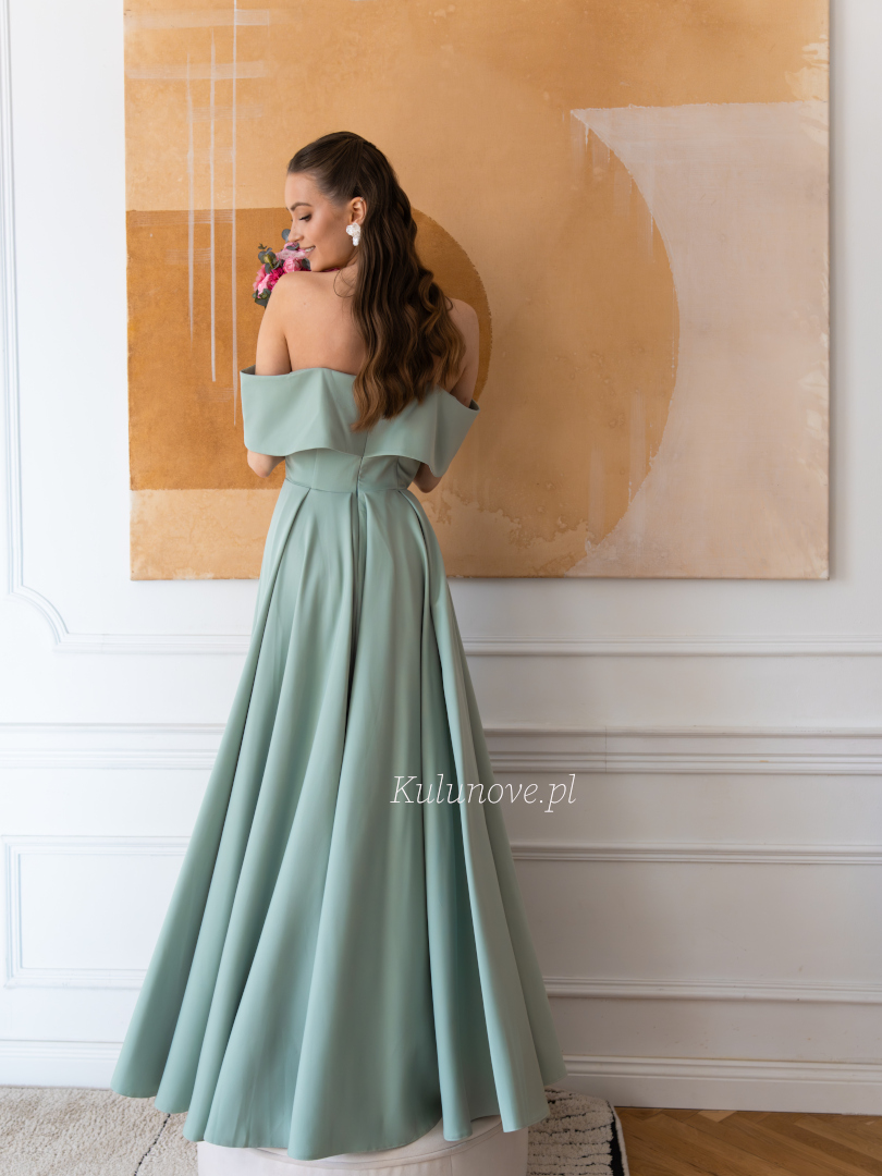A maxi dress with a wide, flared bottom that adds grace and lightness to the silhouette.