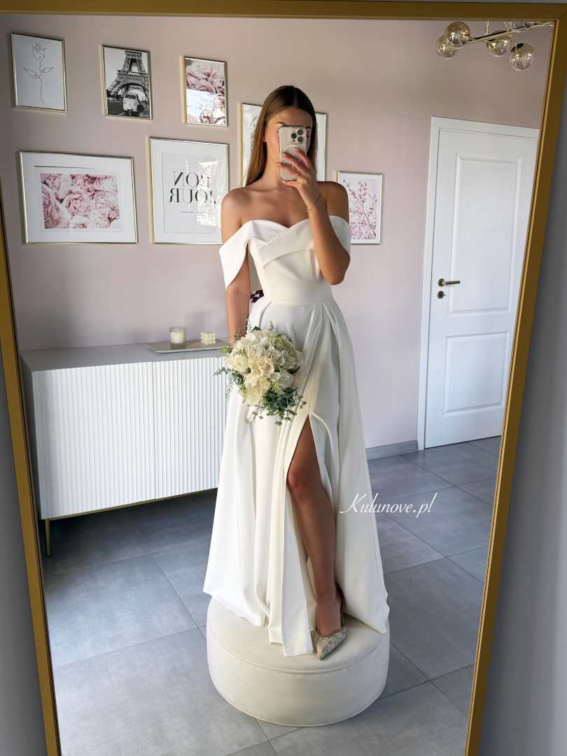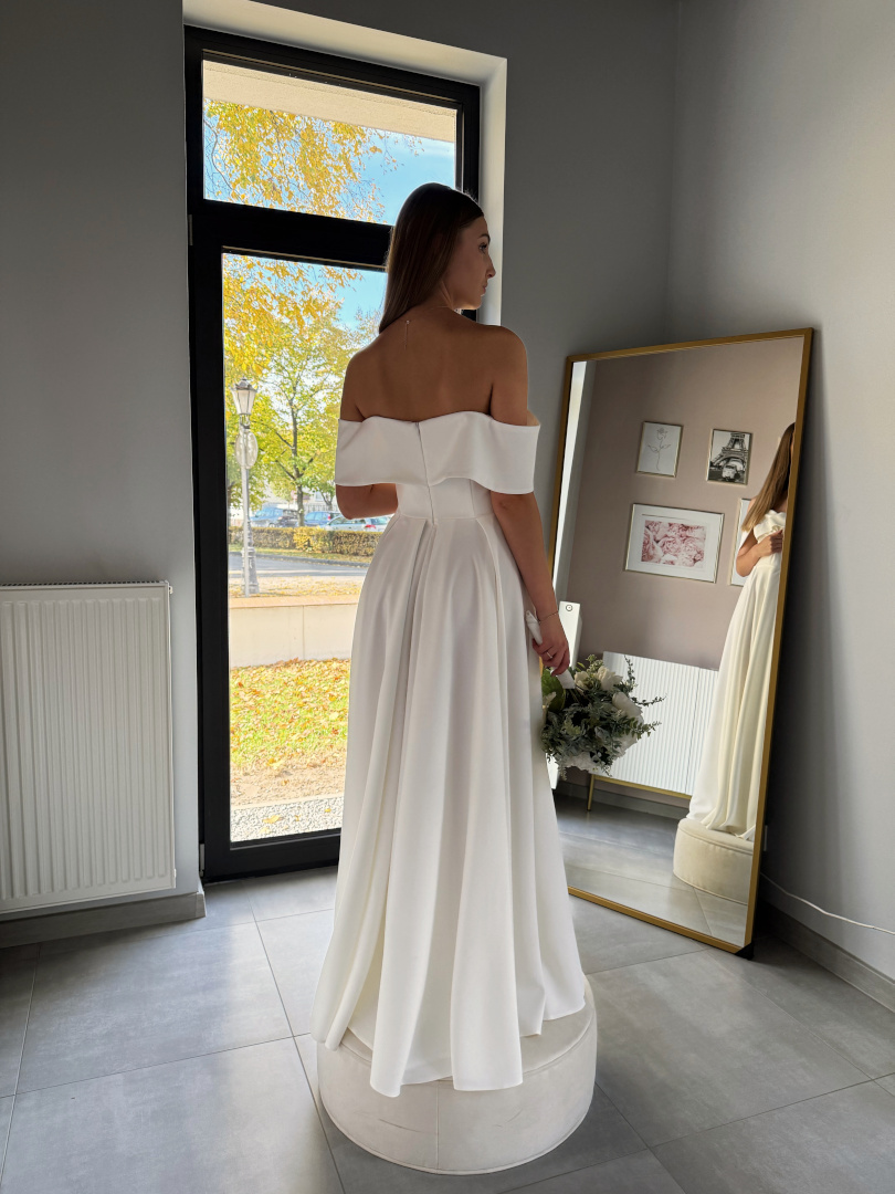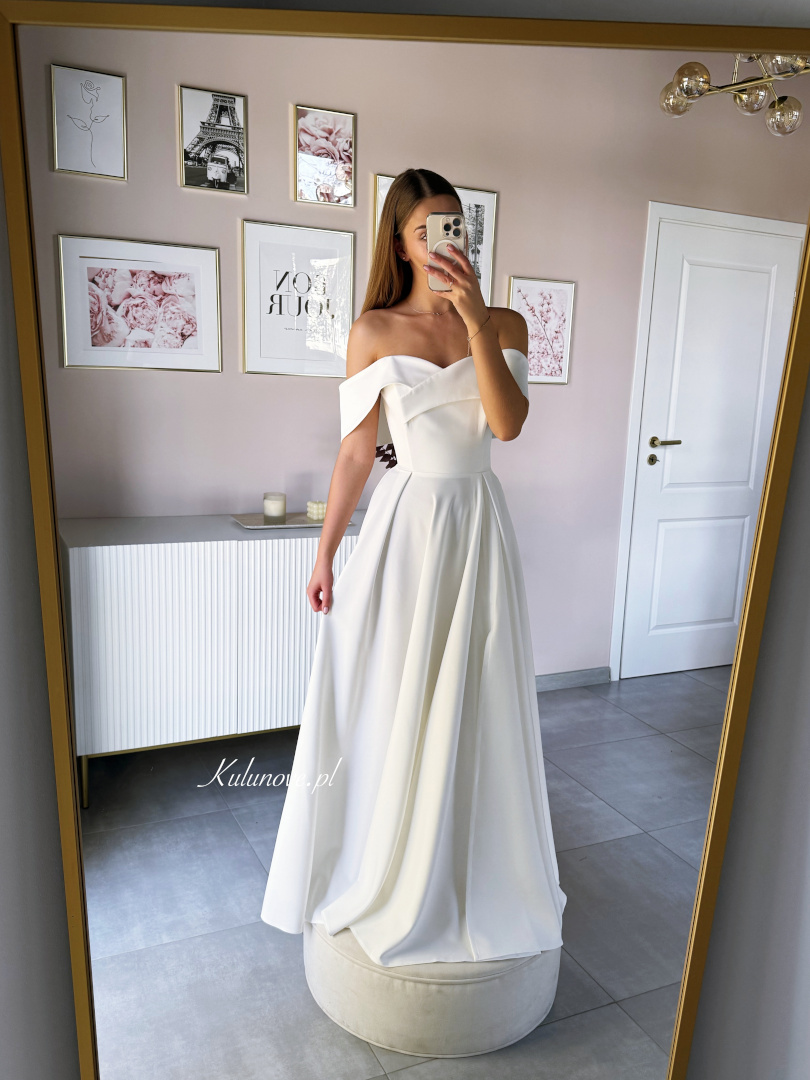 Angelina maxi - ecru colored wedding dress sewn on a wide circle with bare shoulders