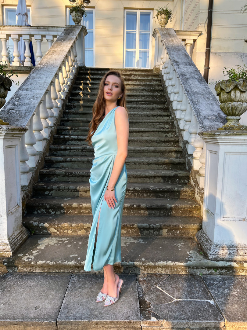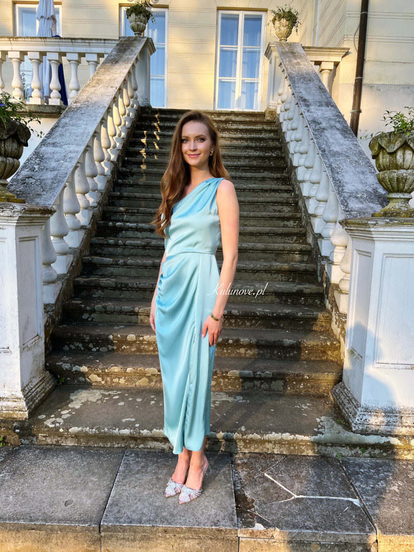 Satin one shoulder midi length dress.