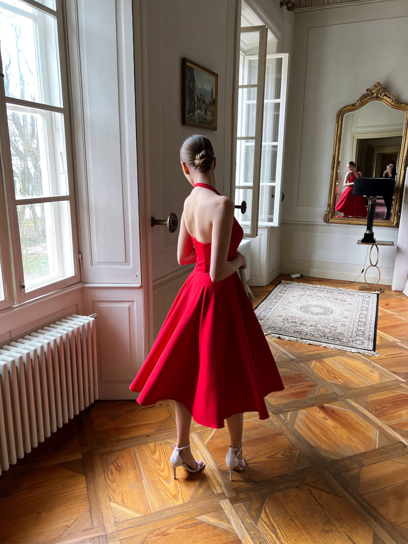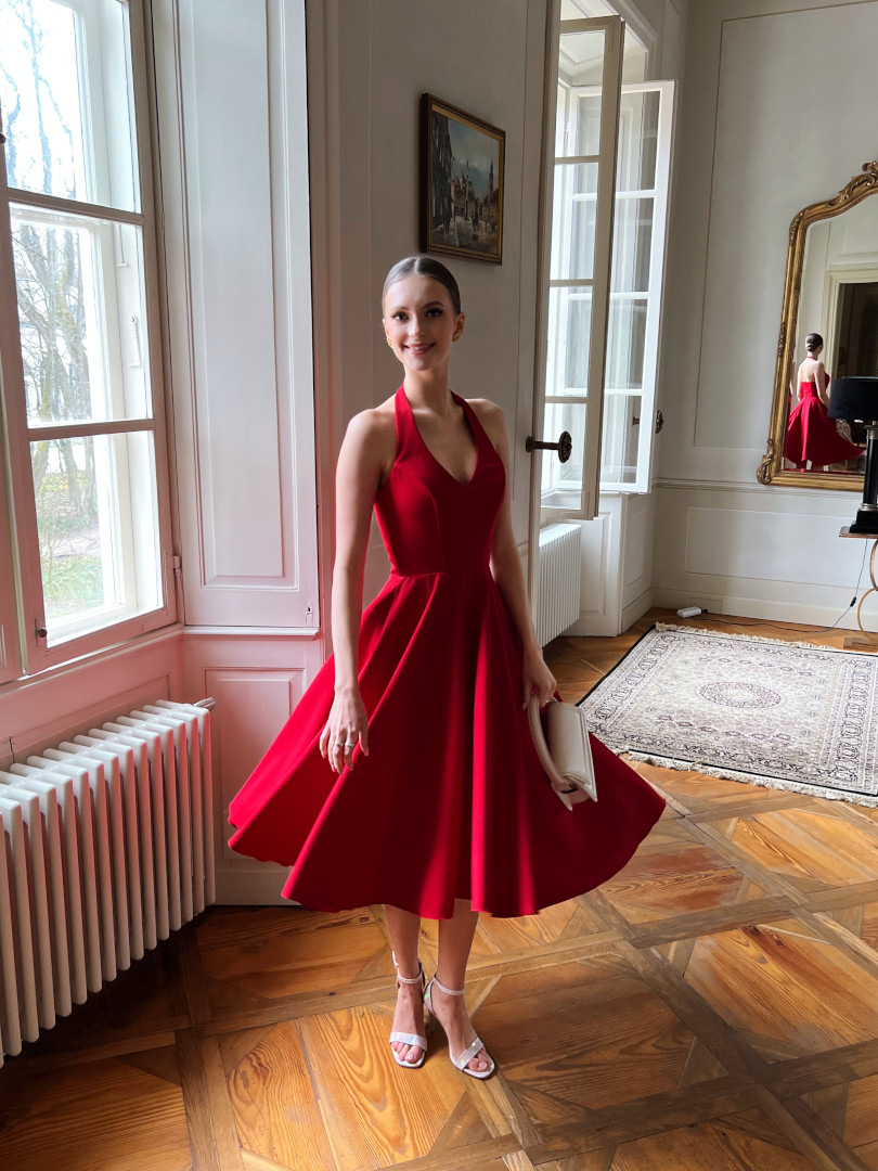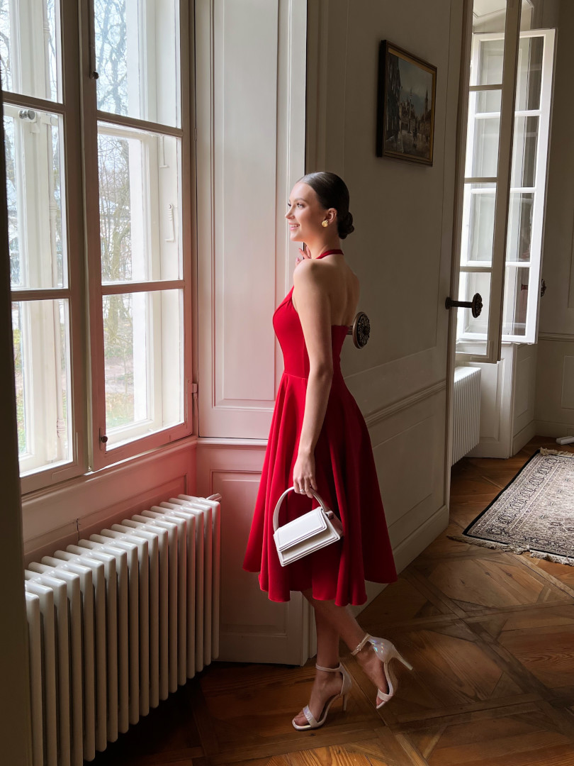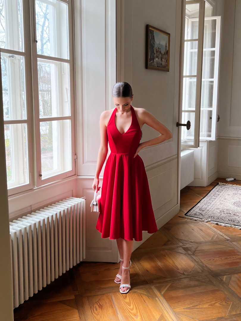 A flared midi dress with open shoulders in red.