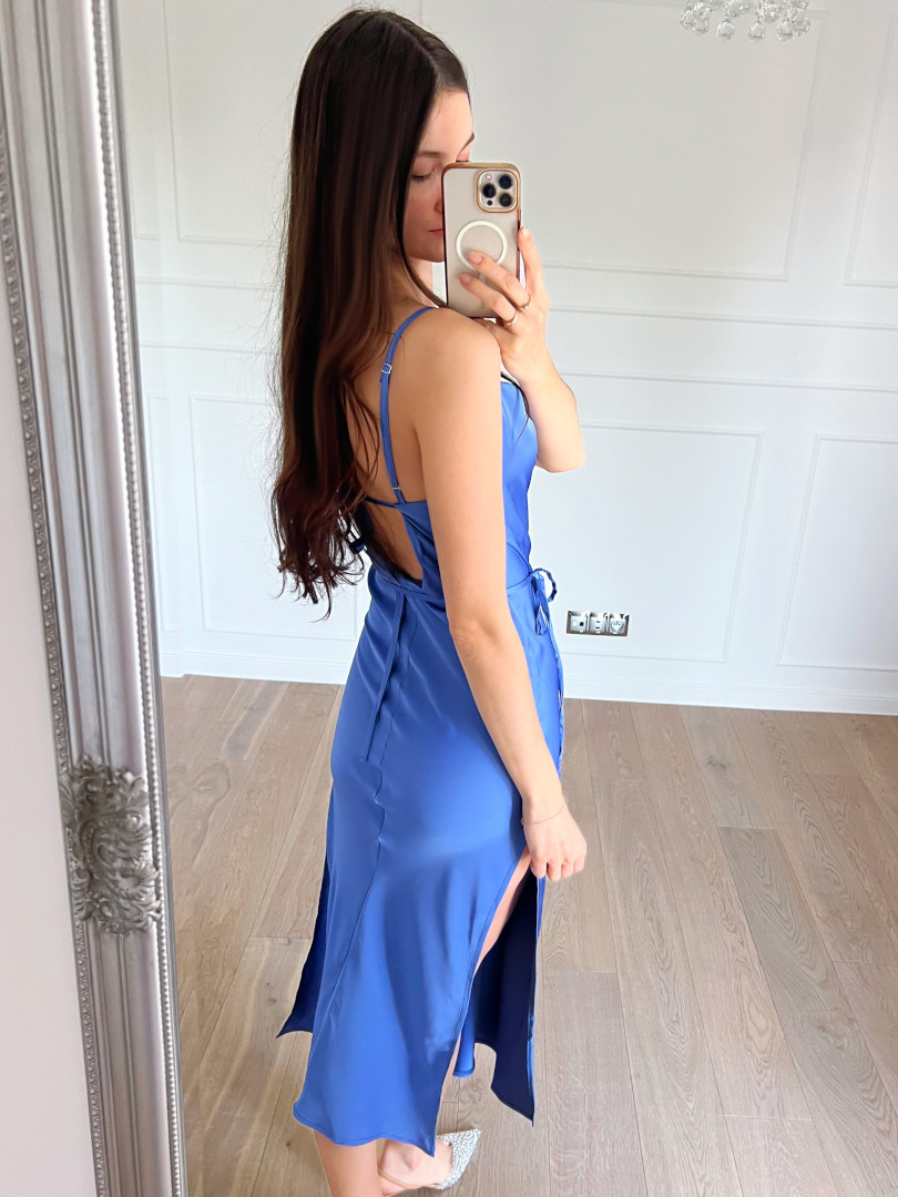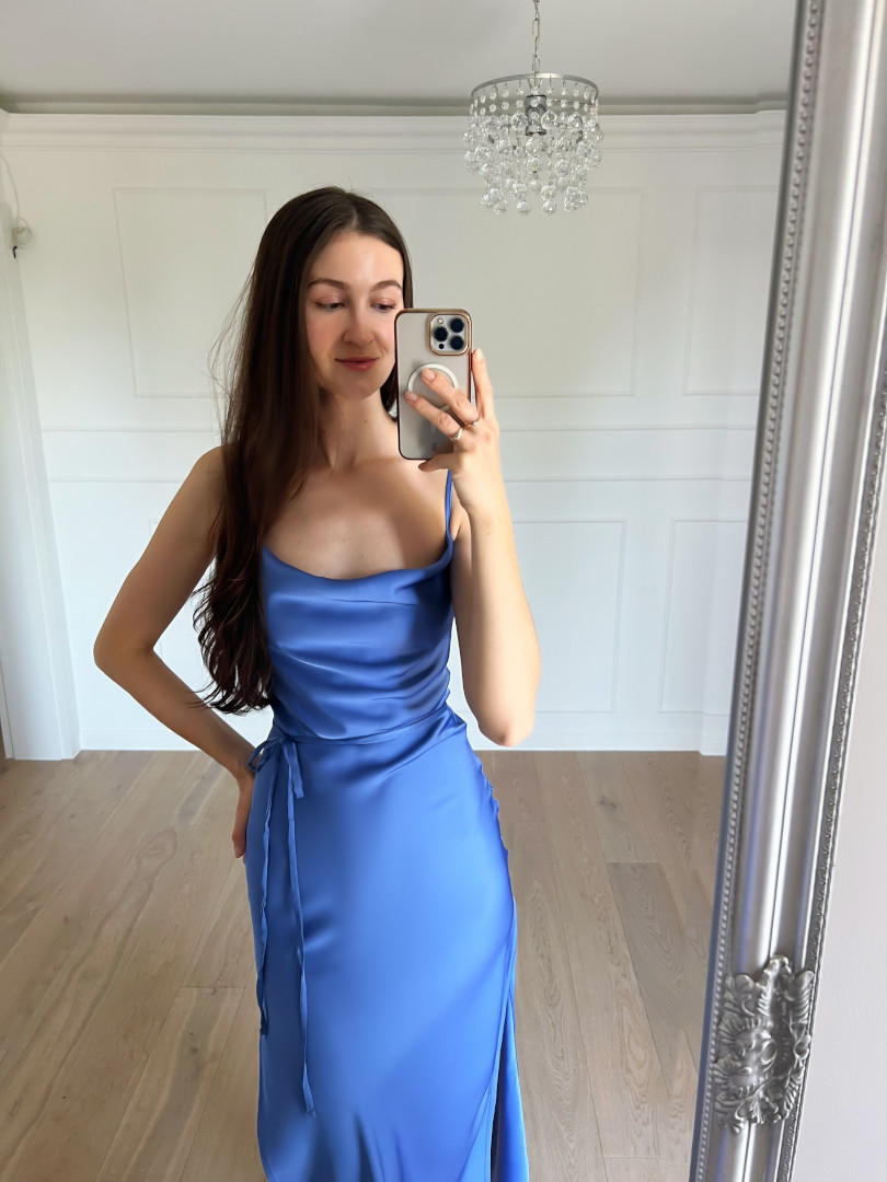 Medium length dress made of airy satin fabric in a beautiful shade of blue.
