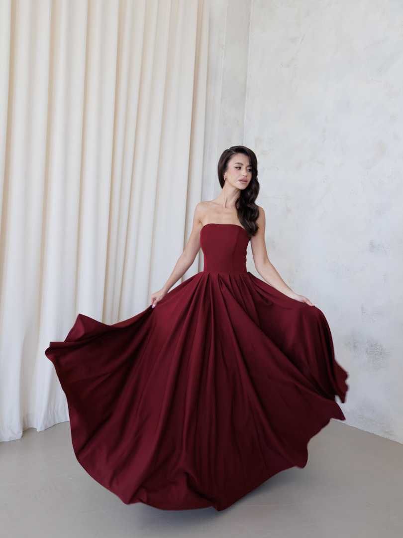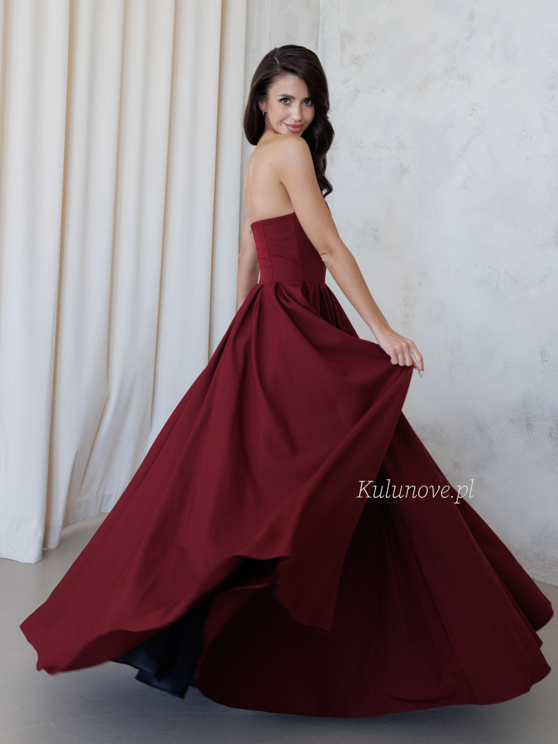The lack of straps subtly exposes the shoulders and neckline, and the deep burgundy color adds a unique character and luxurious glamour to the creation.