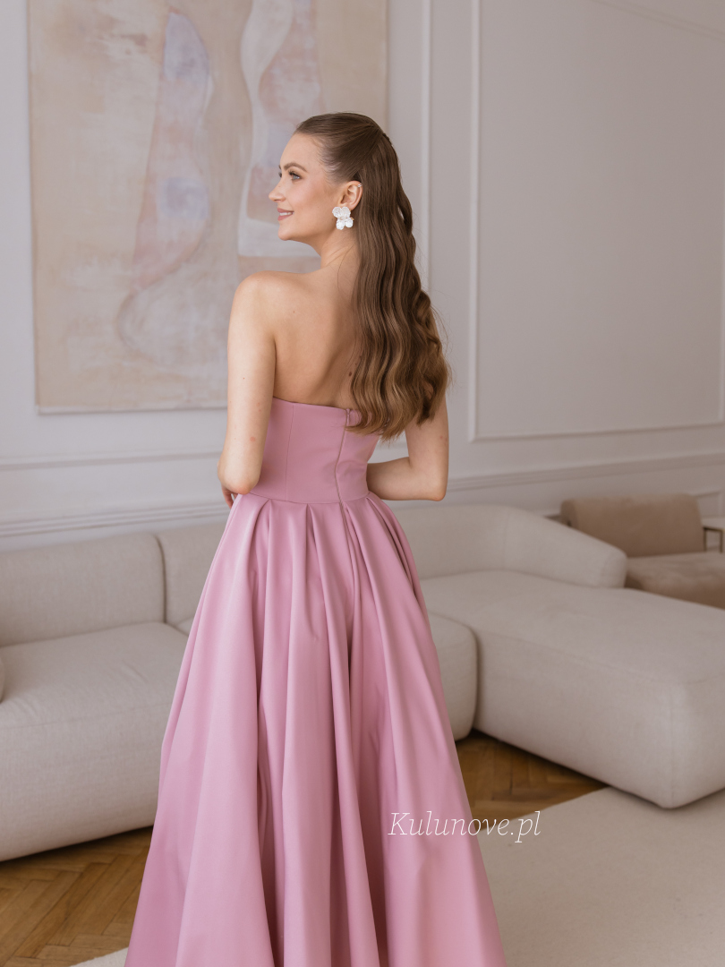 The delicate powder shade of dirty pink emphasizes the romantic and subtle character of the dress.