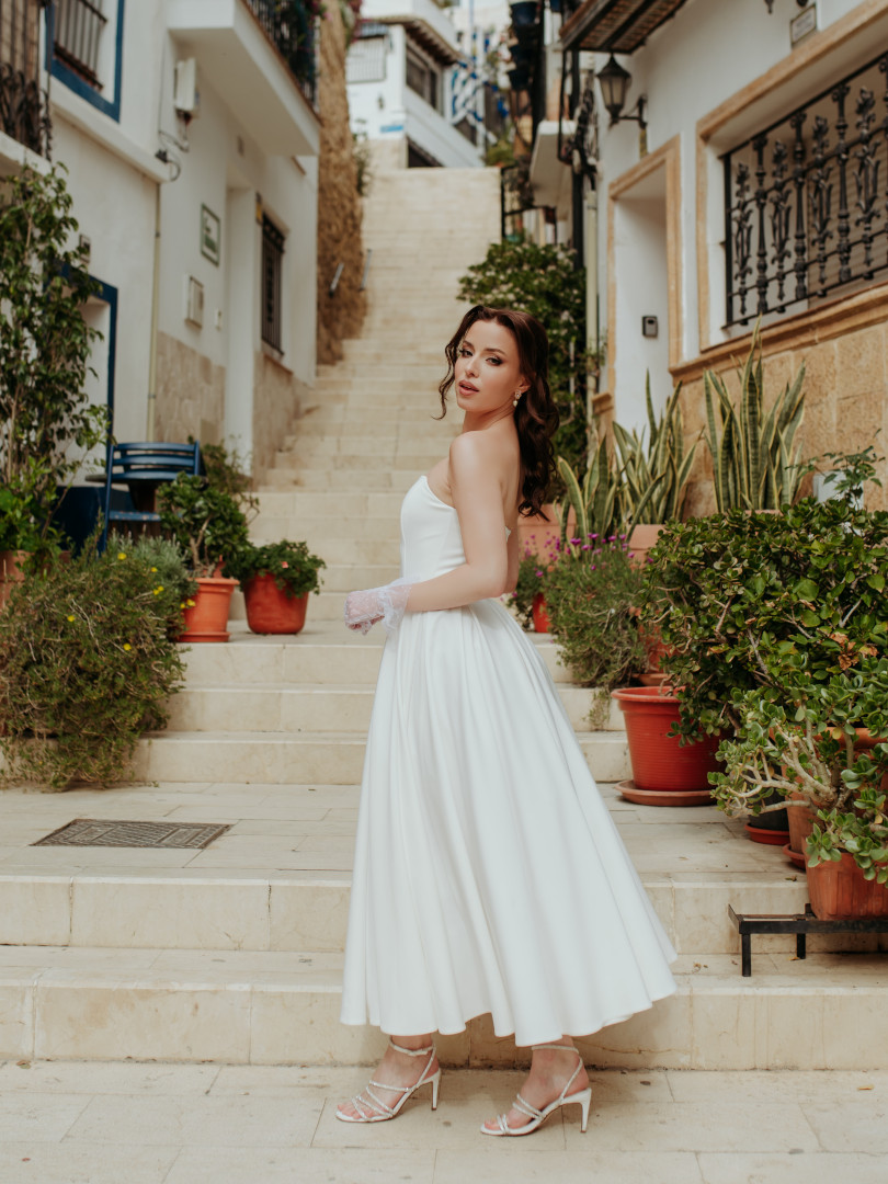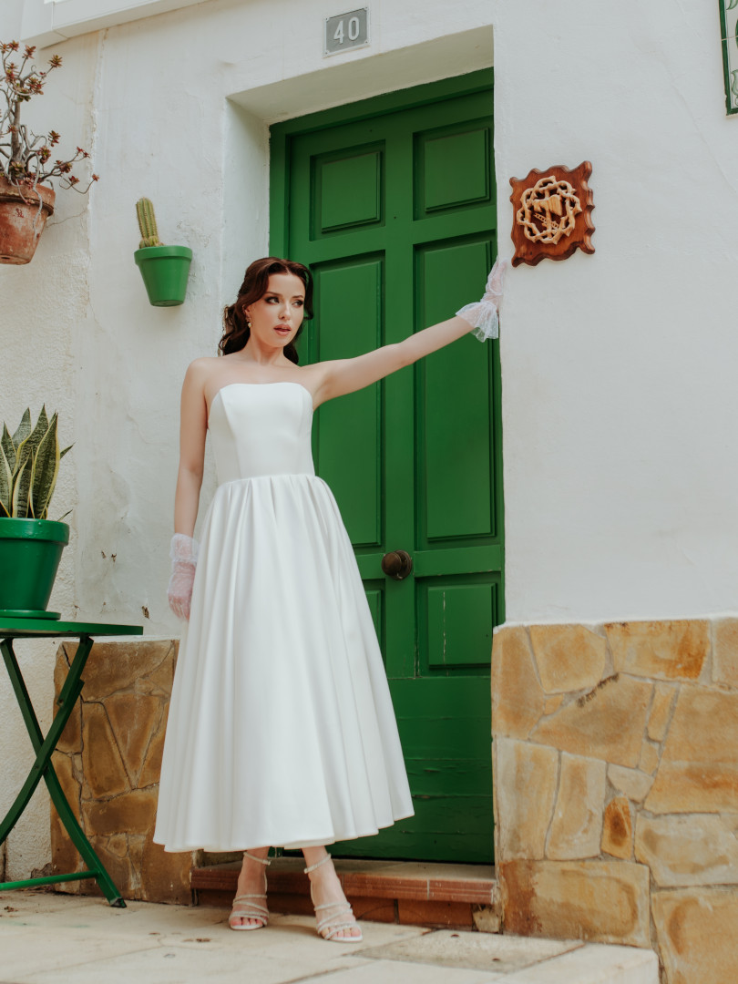 This is an ideal choice for a bride looking for a modern, minimalist wedding dress or a creation for a civil wedding, a reception or a photo shoot.