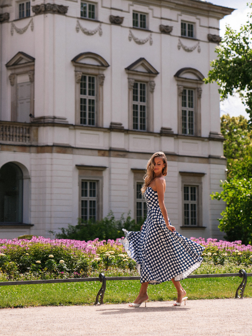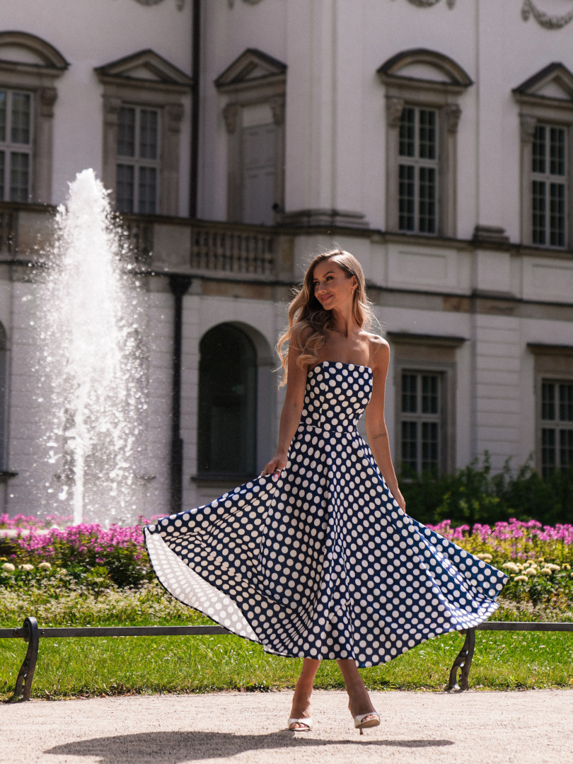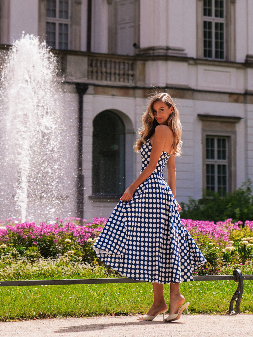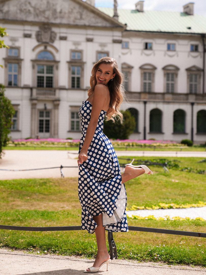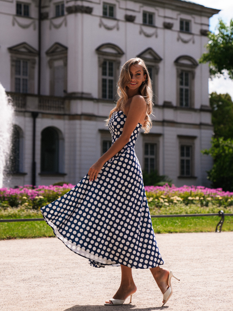 Bridget - corset midi dress navy blue polka dots with a flared bottom