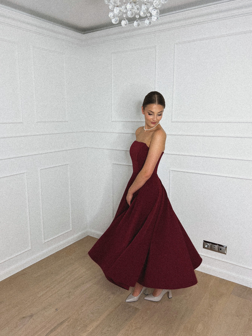The waist is heavily accentuated, below it the material falls softly into a flared hem, creating a subtle A-line.