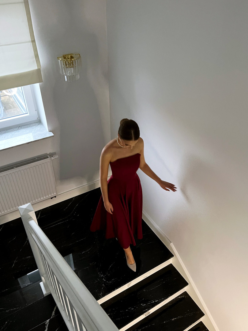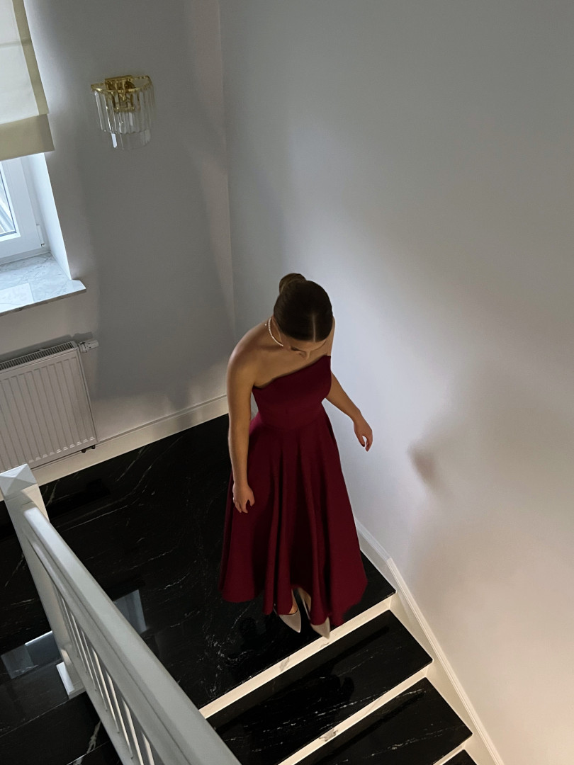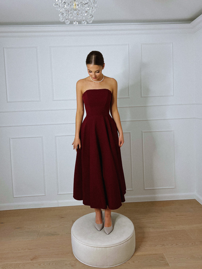 It is strapless, exposes the shoulders and gives a sophisticated look to the styling.