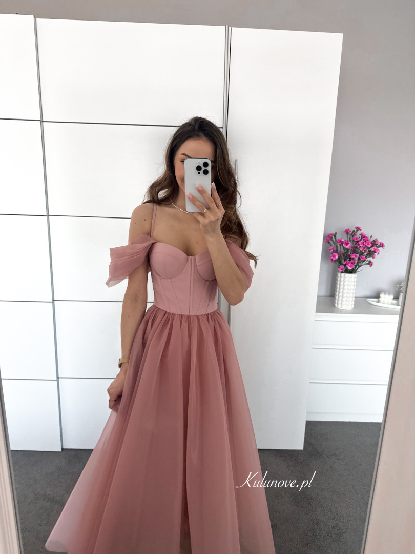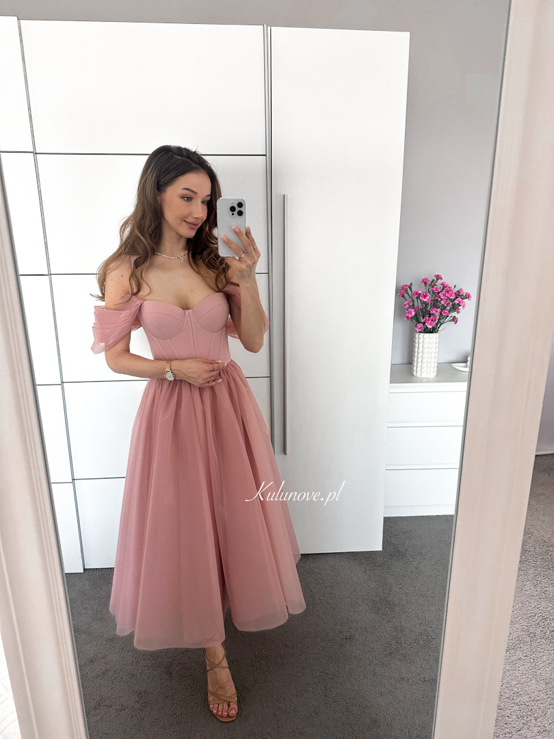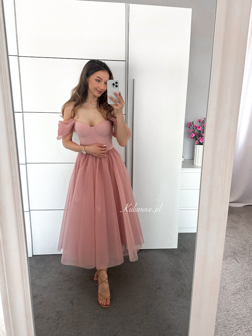 Midi length dress with a flared chiffon skirt for a graceful look.