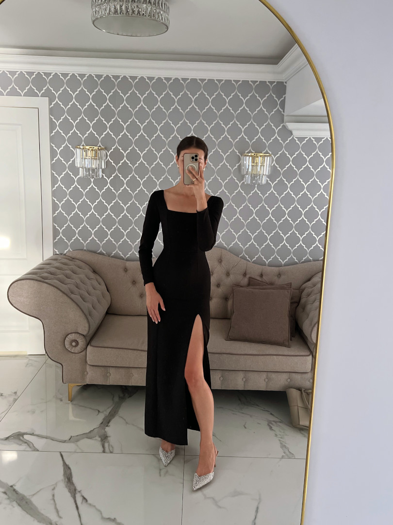 The leg slit introduces an element of lightness and a touch of boldness, making the dress ideal for evening outings or elegant occasions.