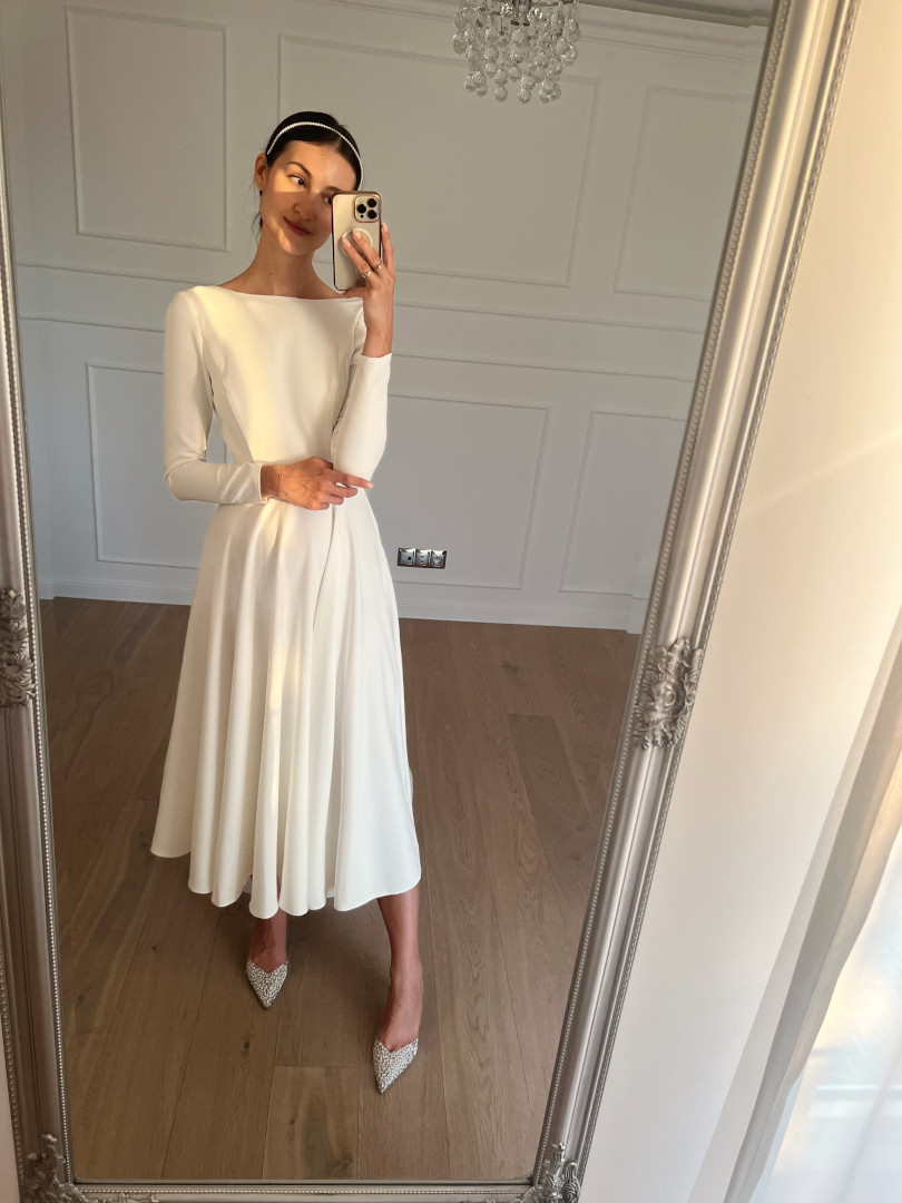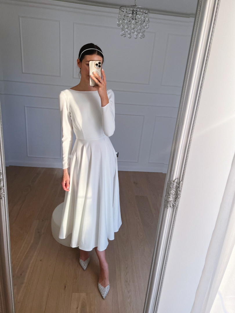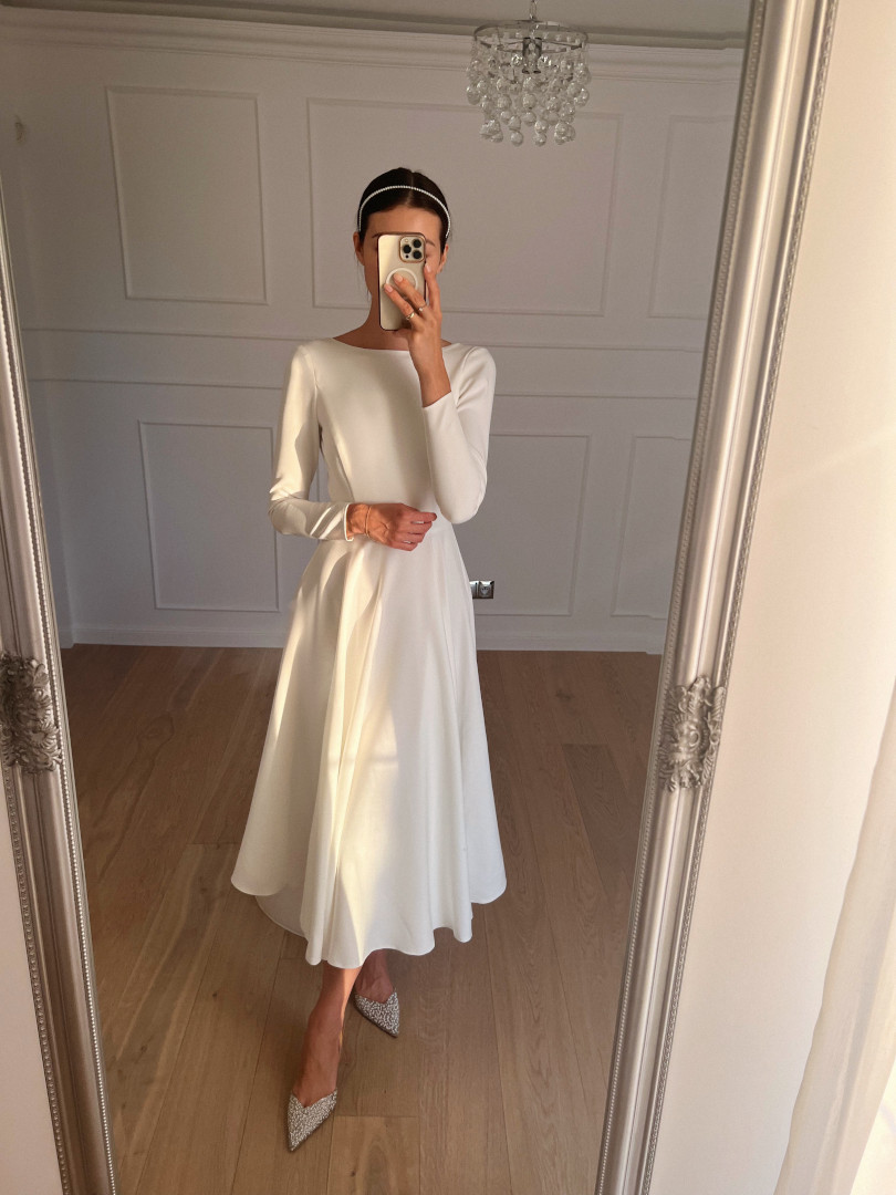 Simple dress in ecru color with medium length.