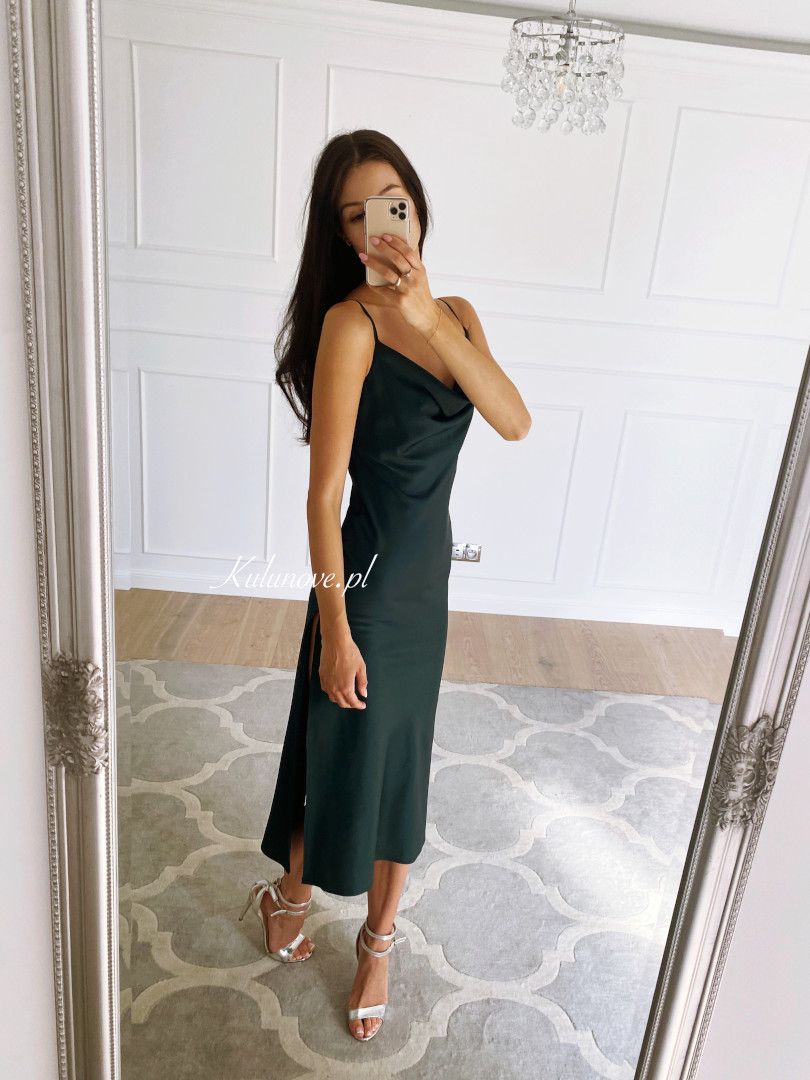 Barcelona A335 - green satin midi dress with striking slit
