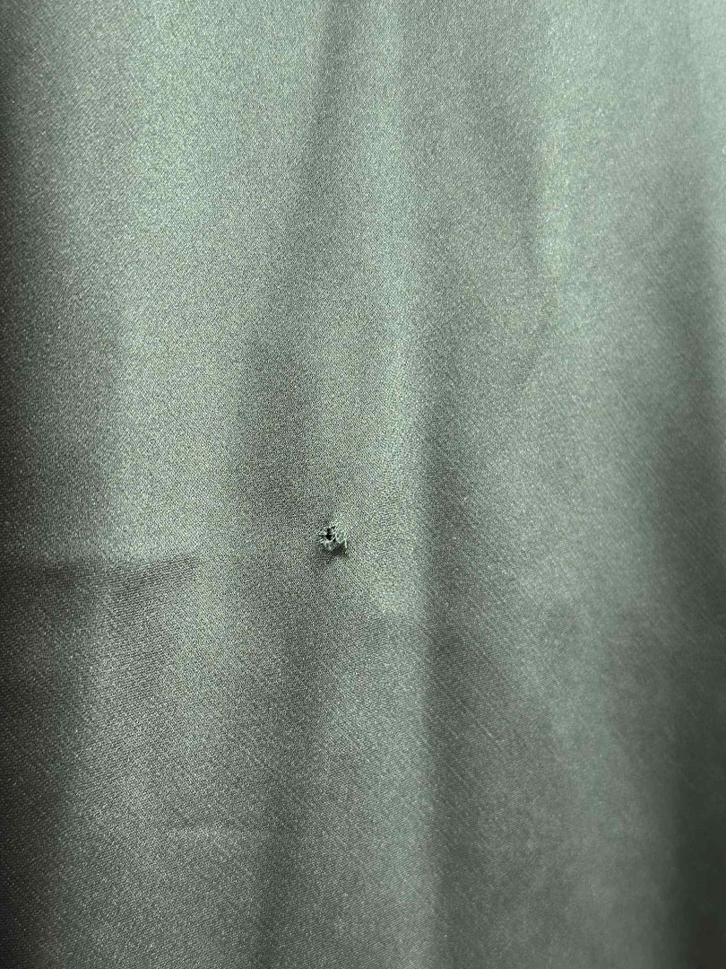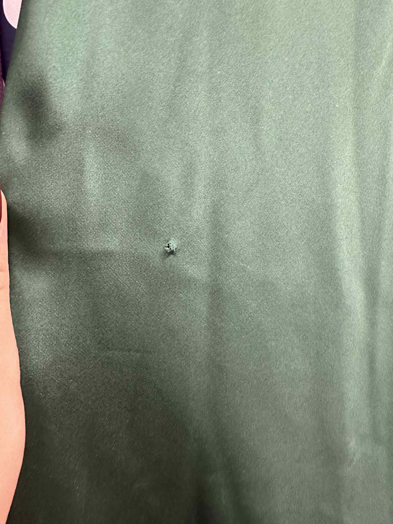 Hole in the fabric about below the knee.