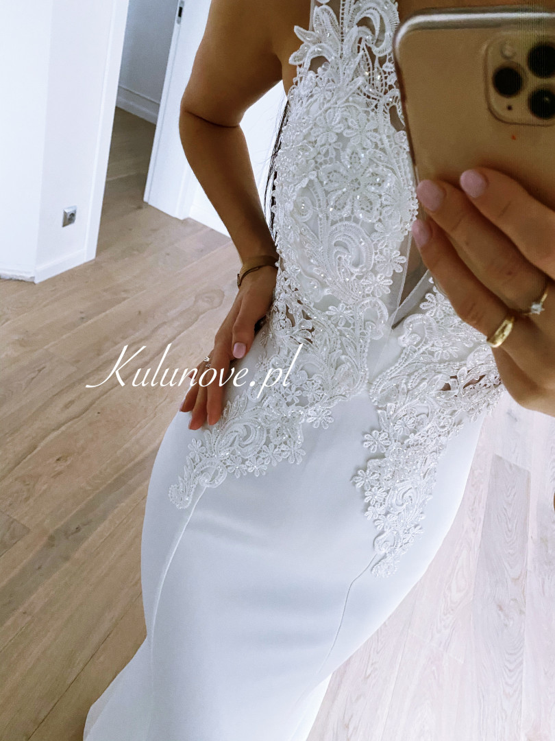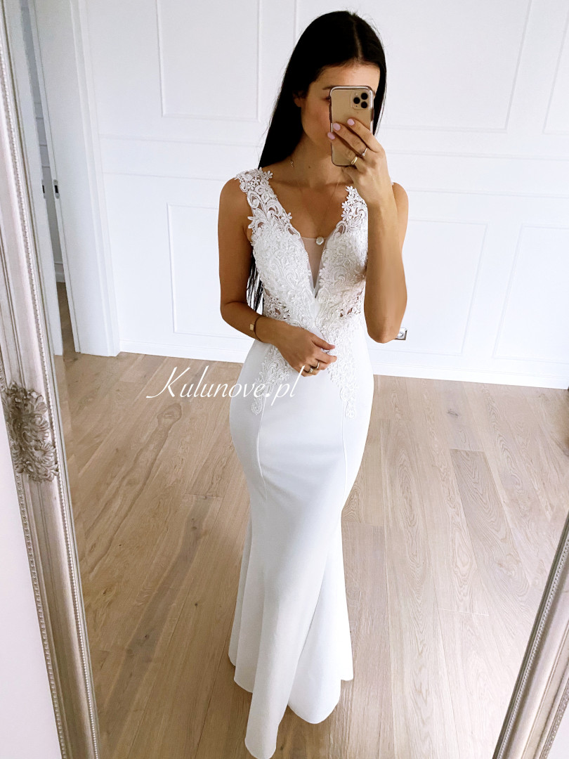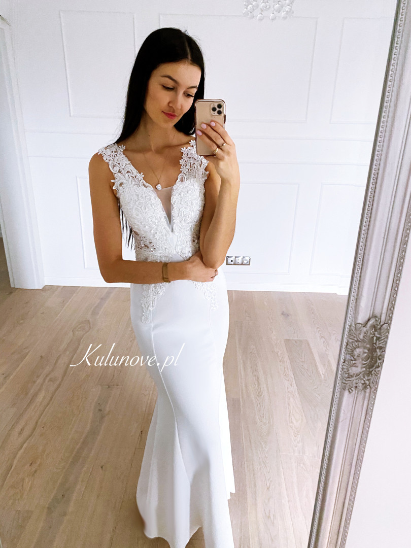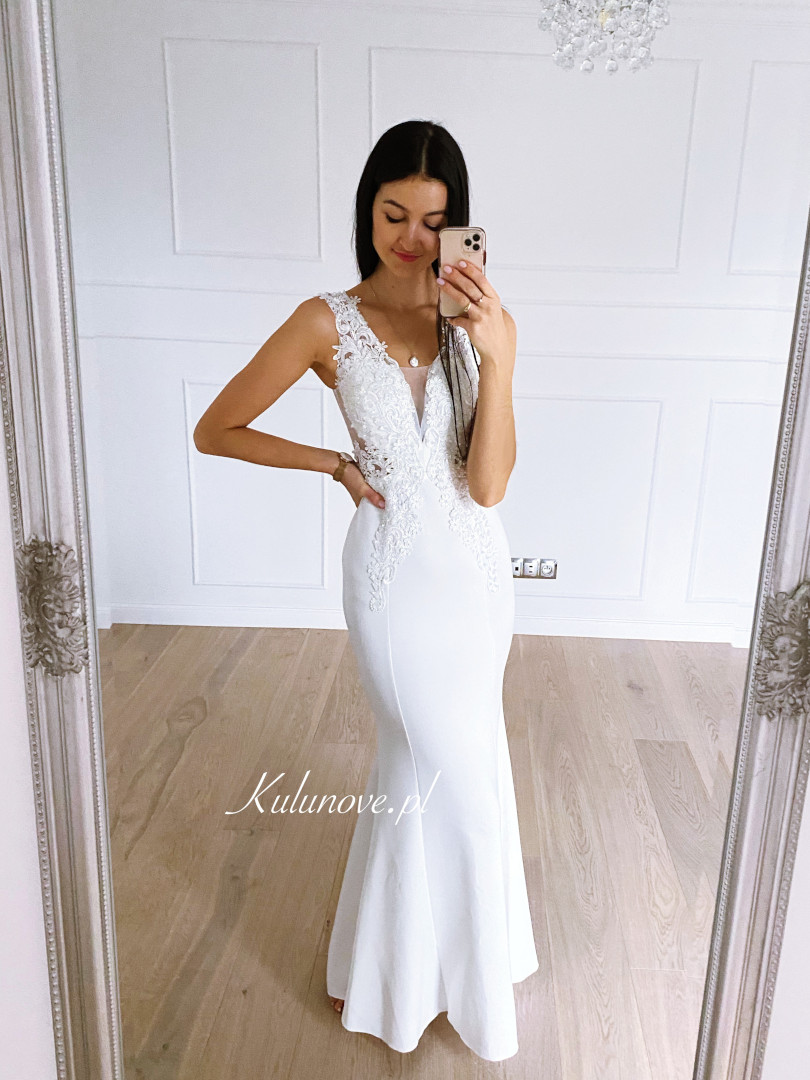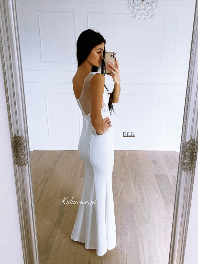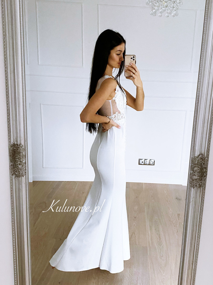 Fitted dress in the shape of a delicate fishtail with a richly decorated top.