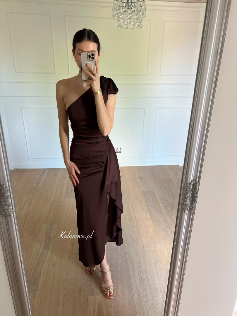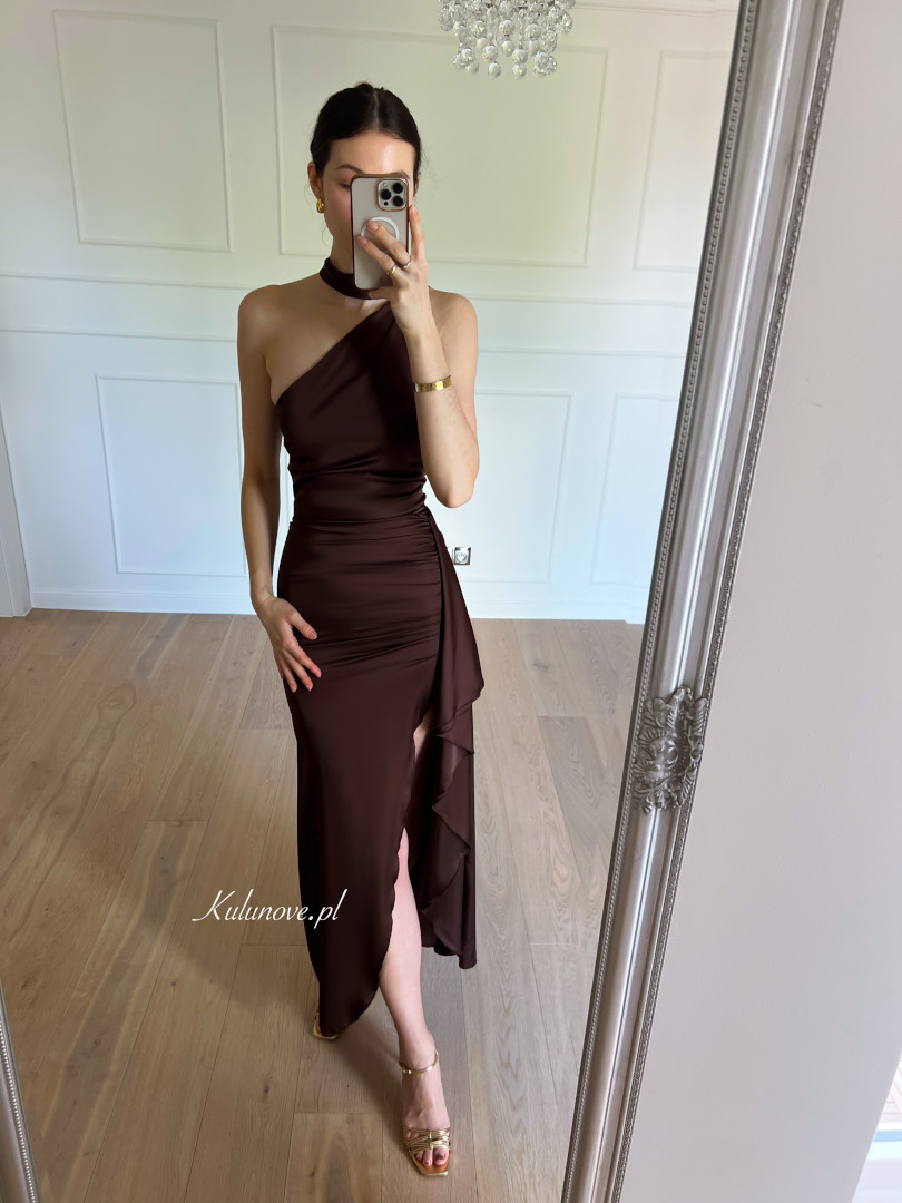 At the zipper, the dress is decorated with a ruffle and a delicate crease.