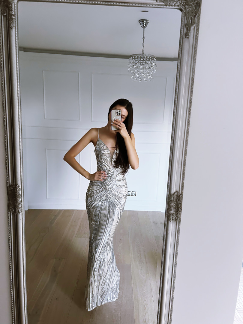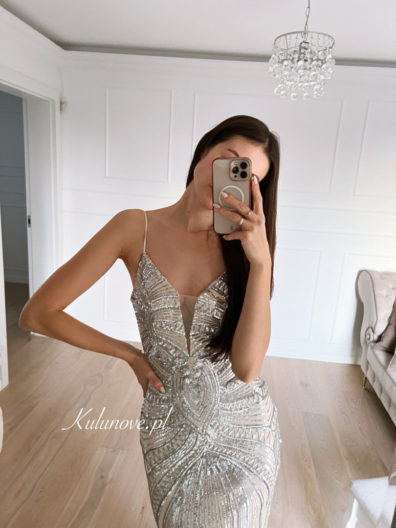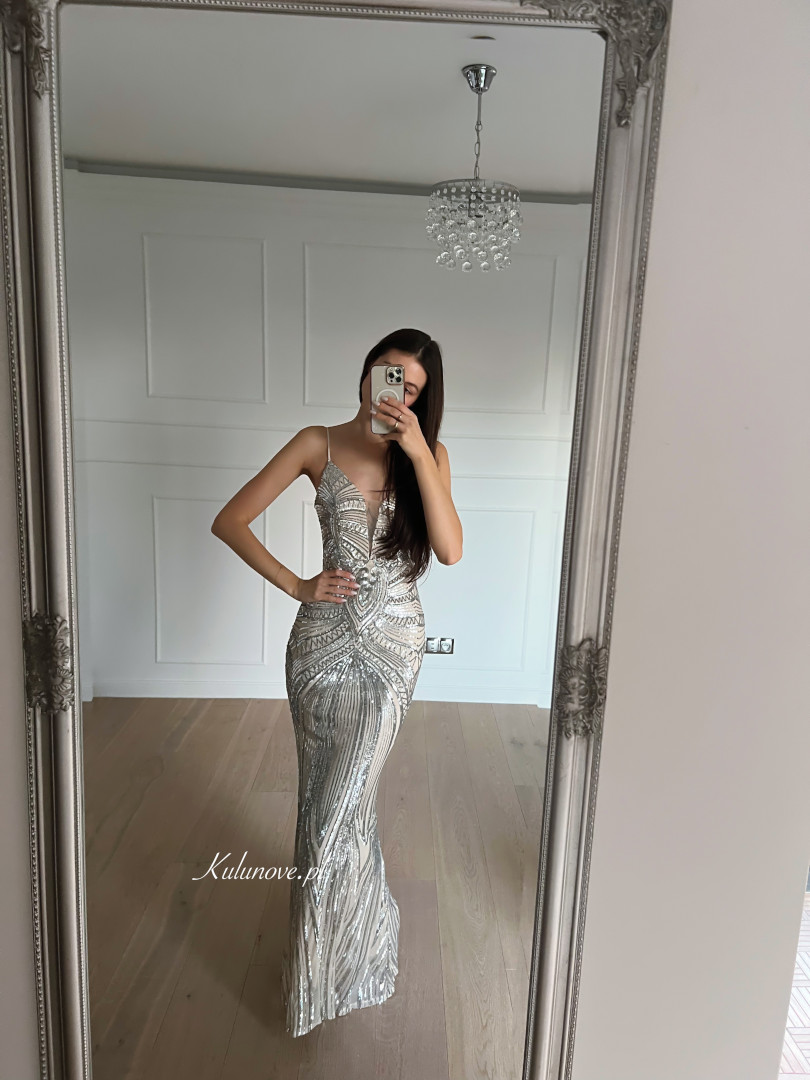 Claudia - silver sequin mermaid shaped dress with beige underlay