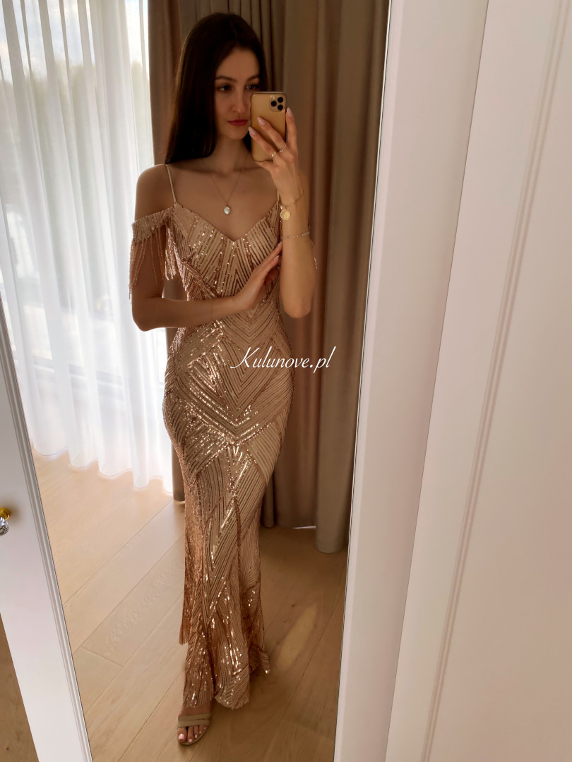 Crystal - sequinned gold fitted dress with plunging sleeves
