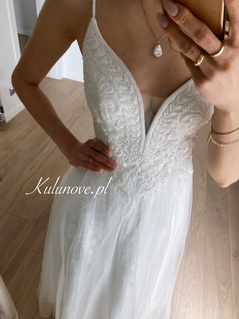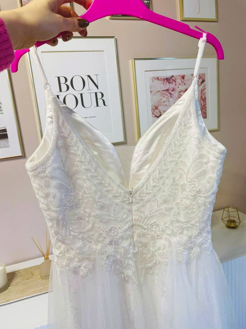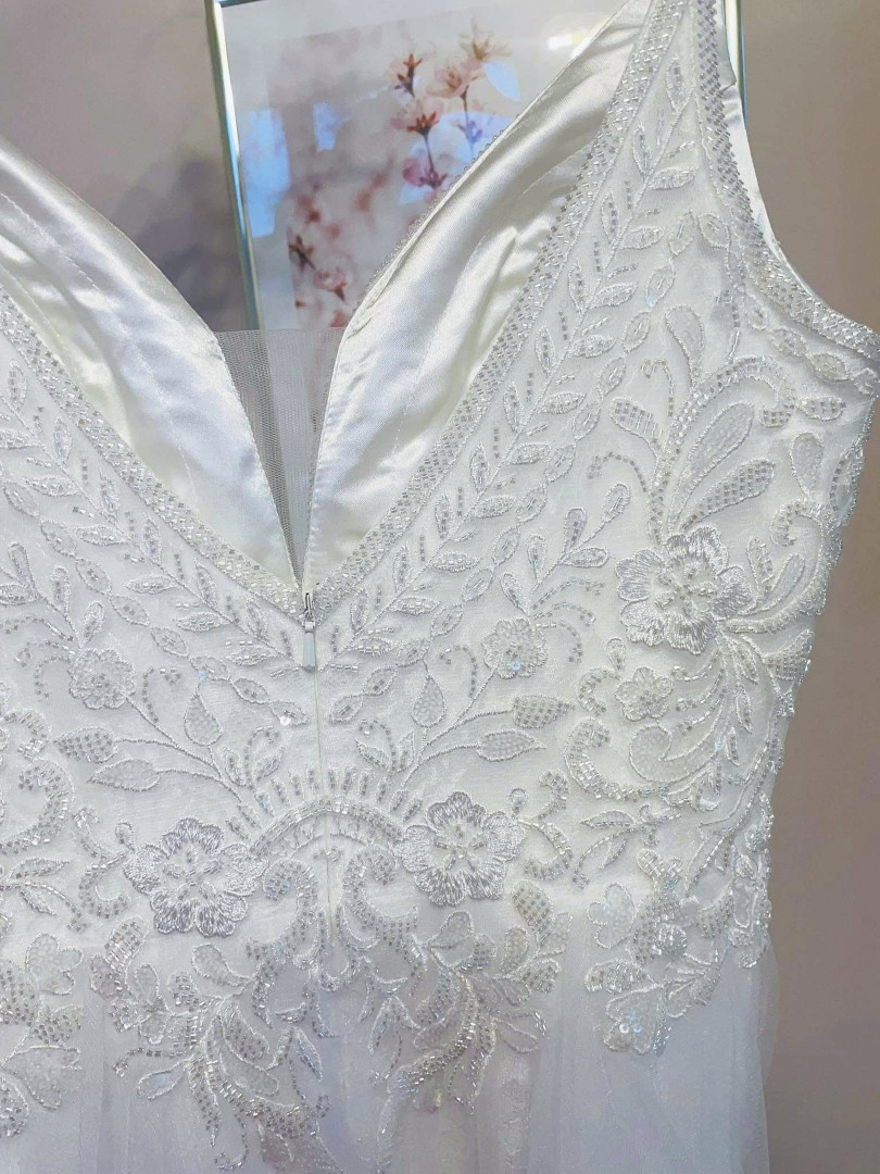 Please take special care when fastening the dress. We suggest making sure the tulle is evenly aligned and not too close to the zipper before fastening. Attention to this detail will help avoid accidental damage and prolong the life of the product.