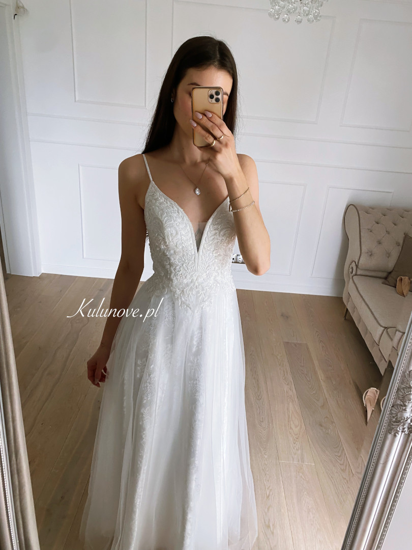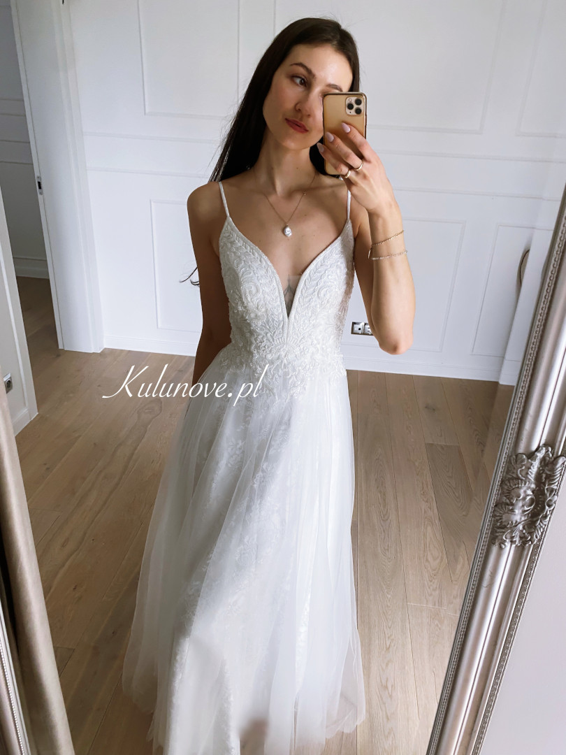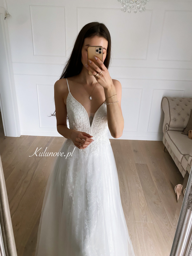 The lace gently pierces through the tulle layer, leaving a delicate glow.