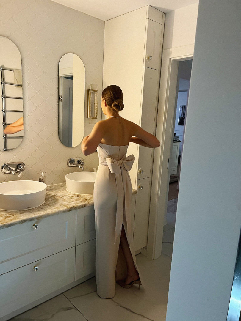 Perfectly tailored, emphasizes the figure, and thanks to the zipper at the back does not restrict movement.