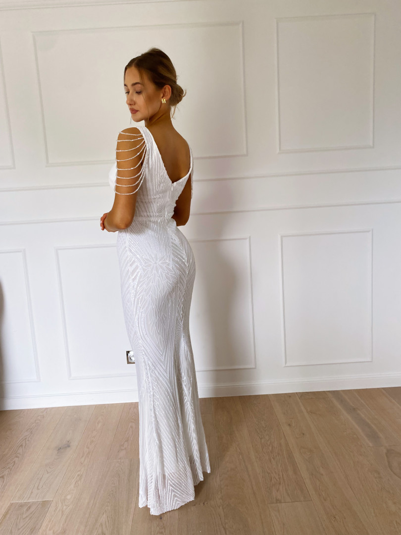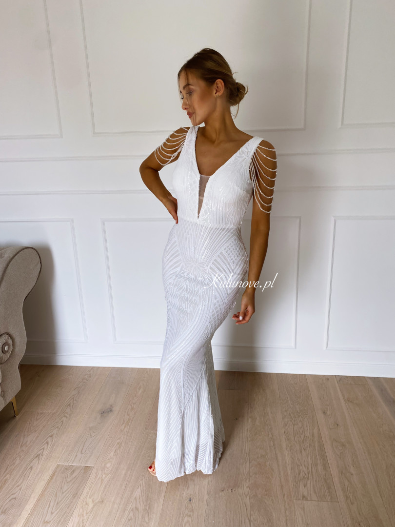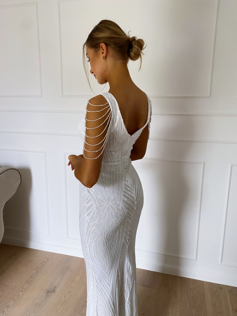 The dress has sewn-in cups. The shoulders are decorated with chains.