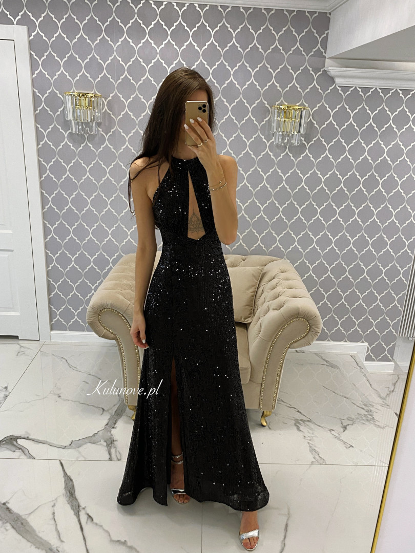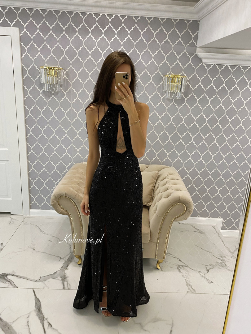 The dress is fastened with a covered zipper and decorative buttons on the back of the dress.