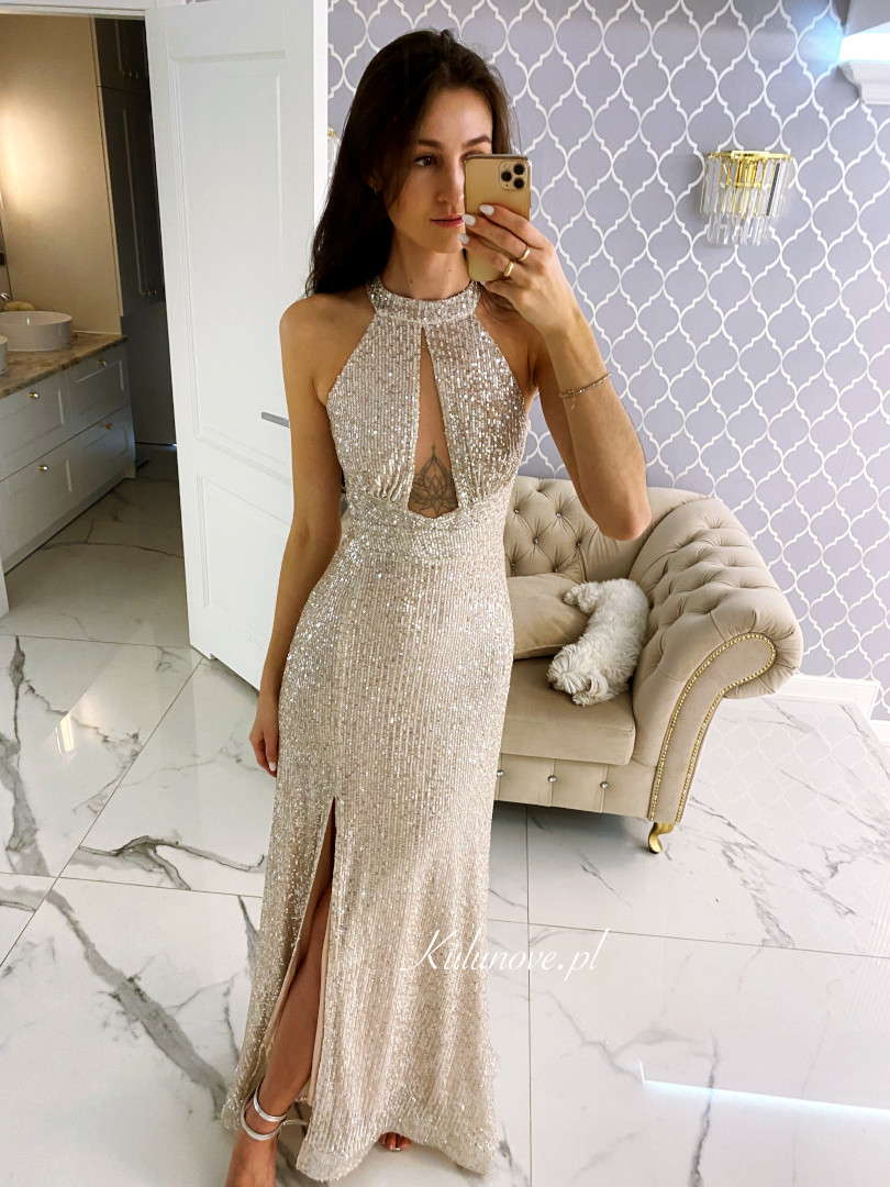 Amazing maxi length dress entirely covered with shiny sequins.