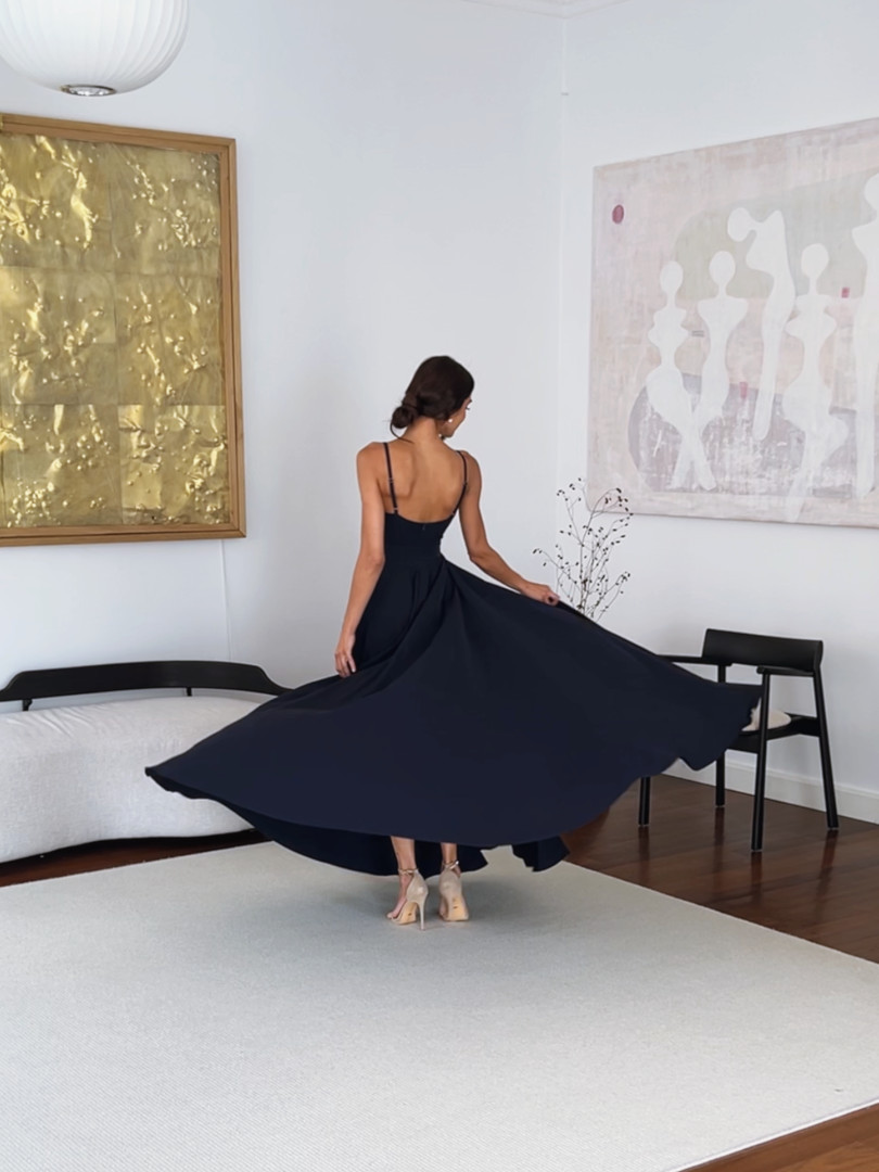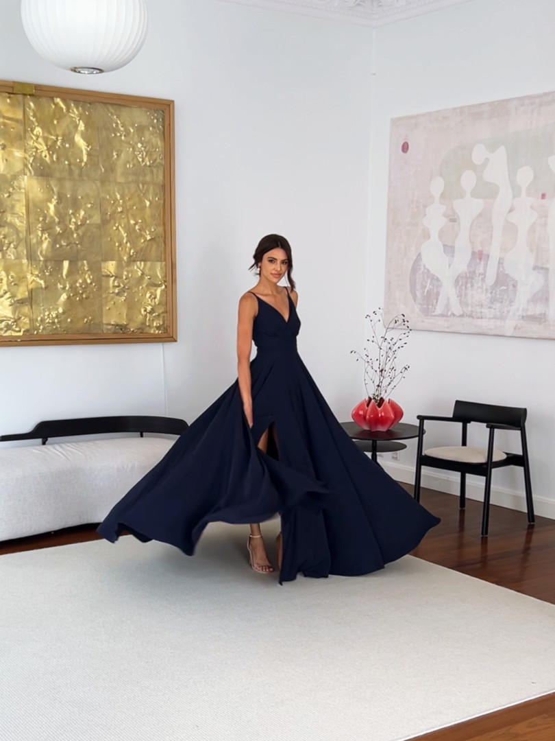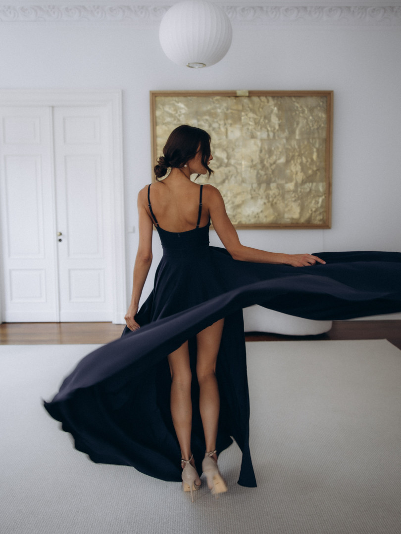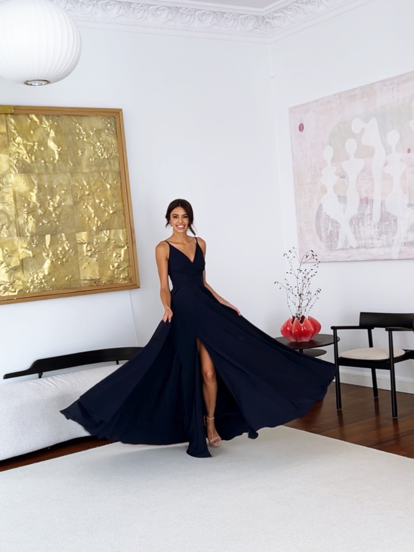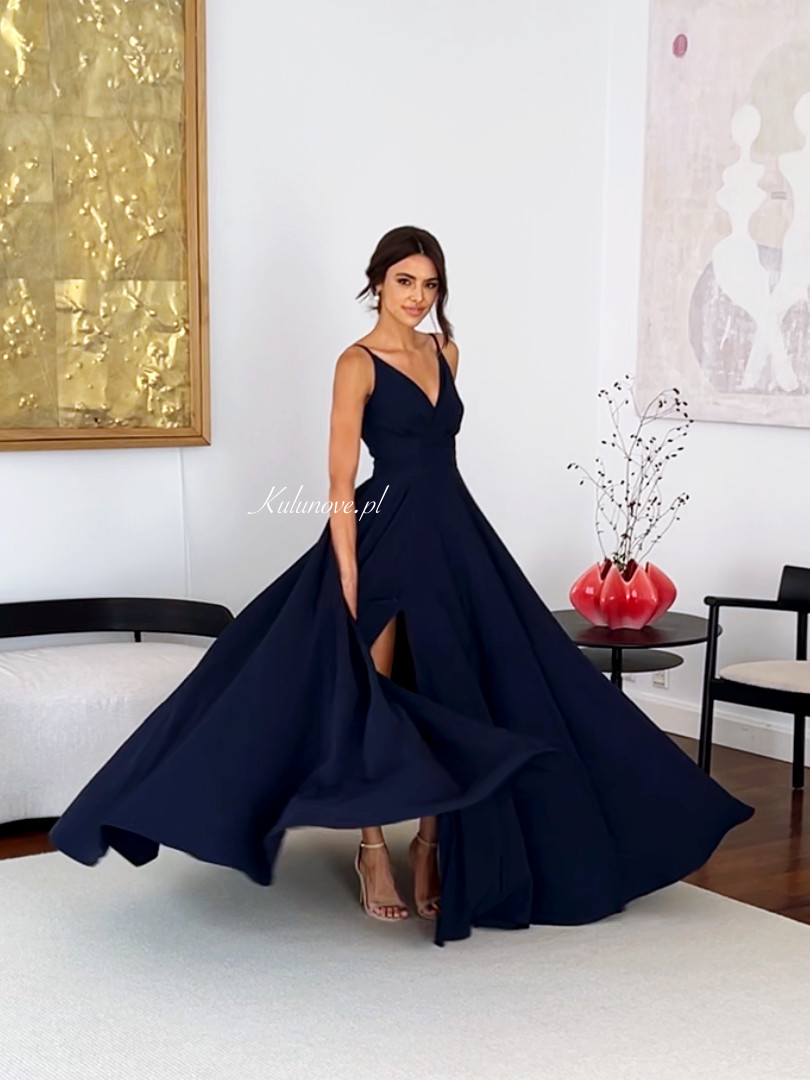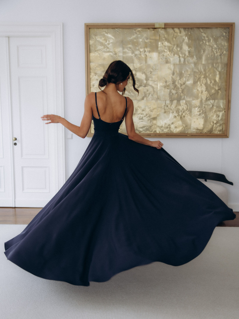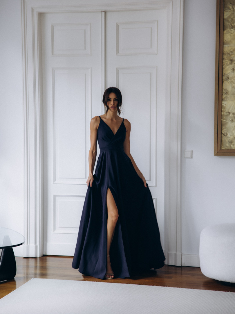 Elisabeth maxi - navy blue dress with a very open bottom with an overlapping neckline