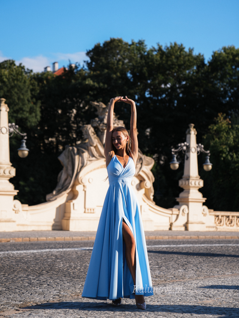 Deep V-shaped neckline and subtle creases at the waist beautifully shape the silhouette, while the slit in the skirt adds lightness and sensuality.