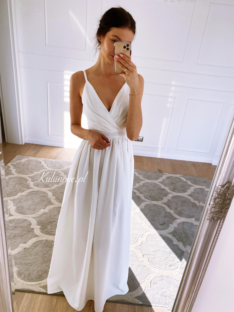 Long strapless dress with an overlap neckline.