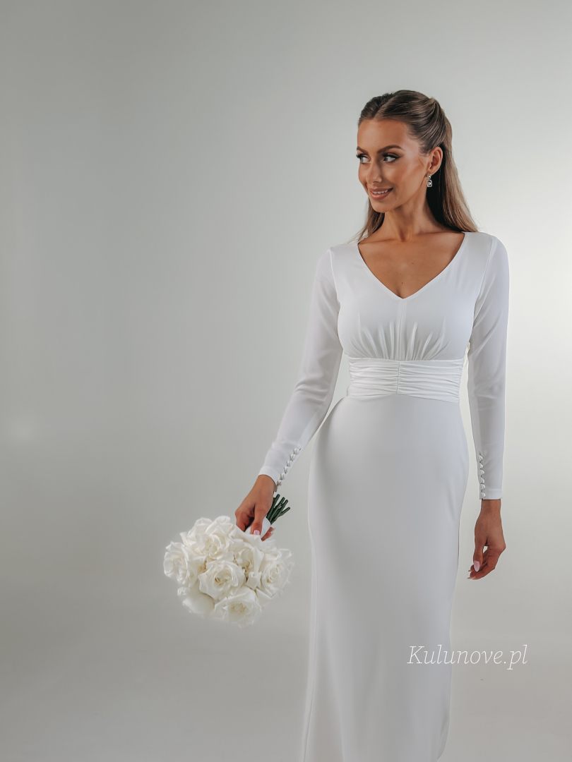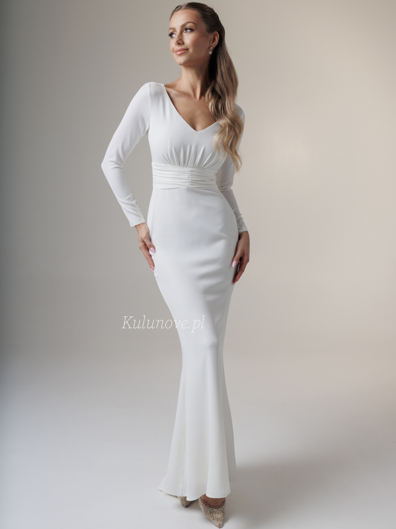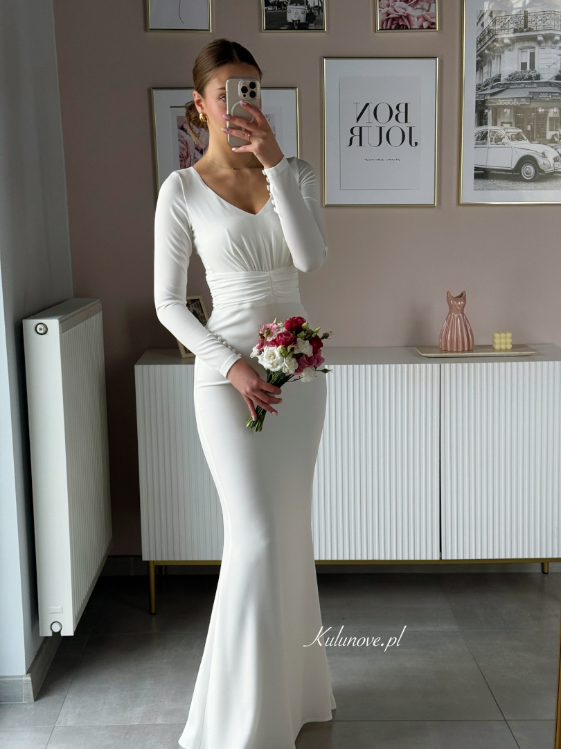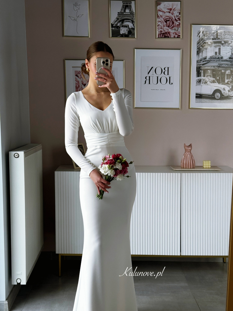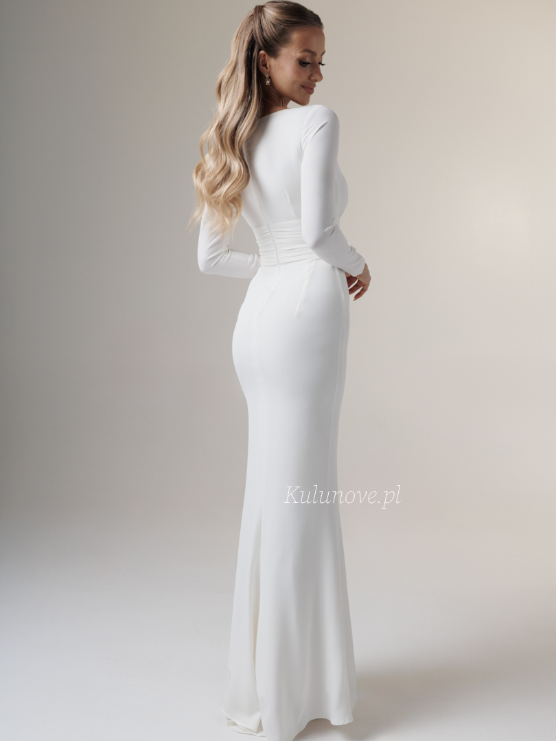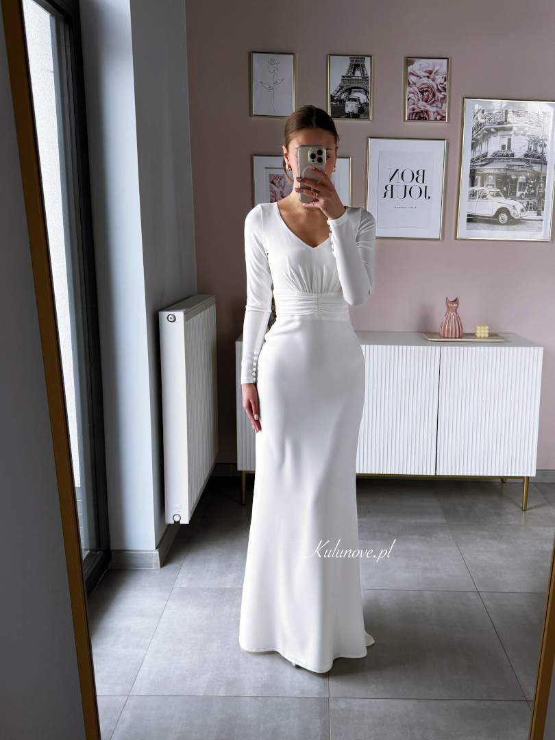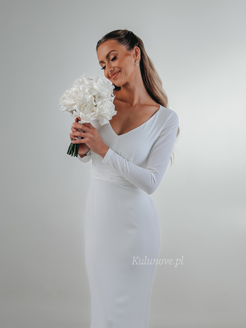 Long, fitted, made of smooth white fabric. It has long, close-fitting sleeves and a V-neckline, which subtly emphasizes the neckline and décolletage.