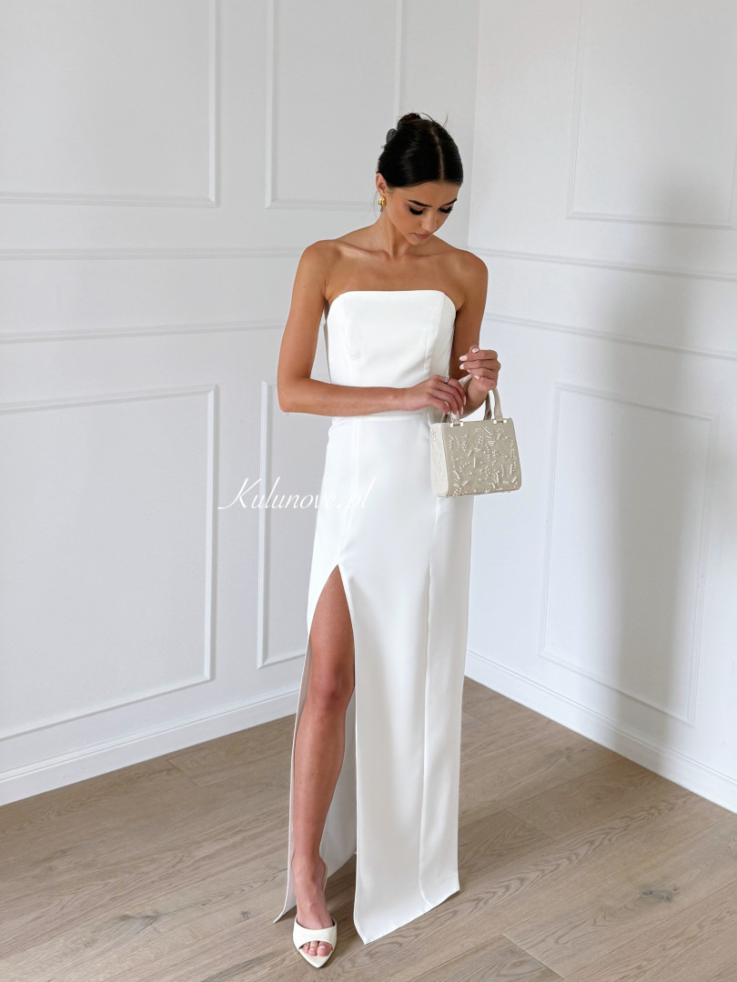 The corset top with a simple neckline emphasizes the shoulders and cleavage, and the high slit on the leg gives the creation a light and modern character.