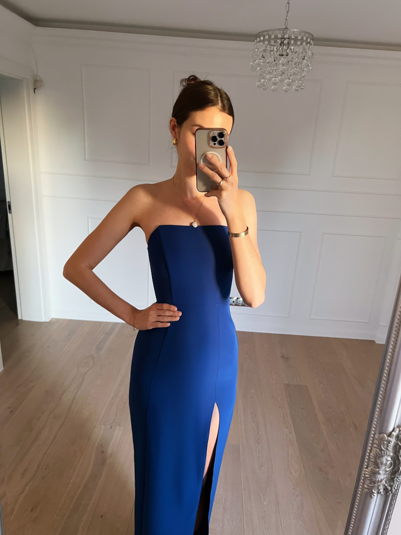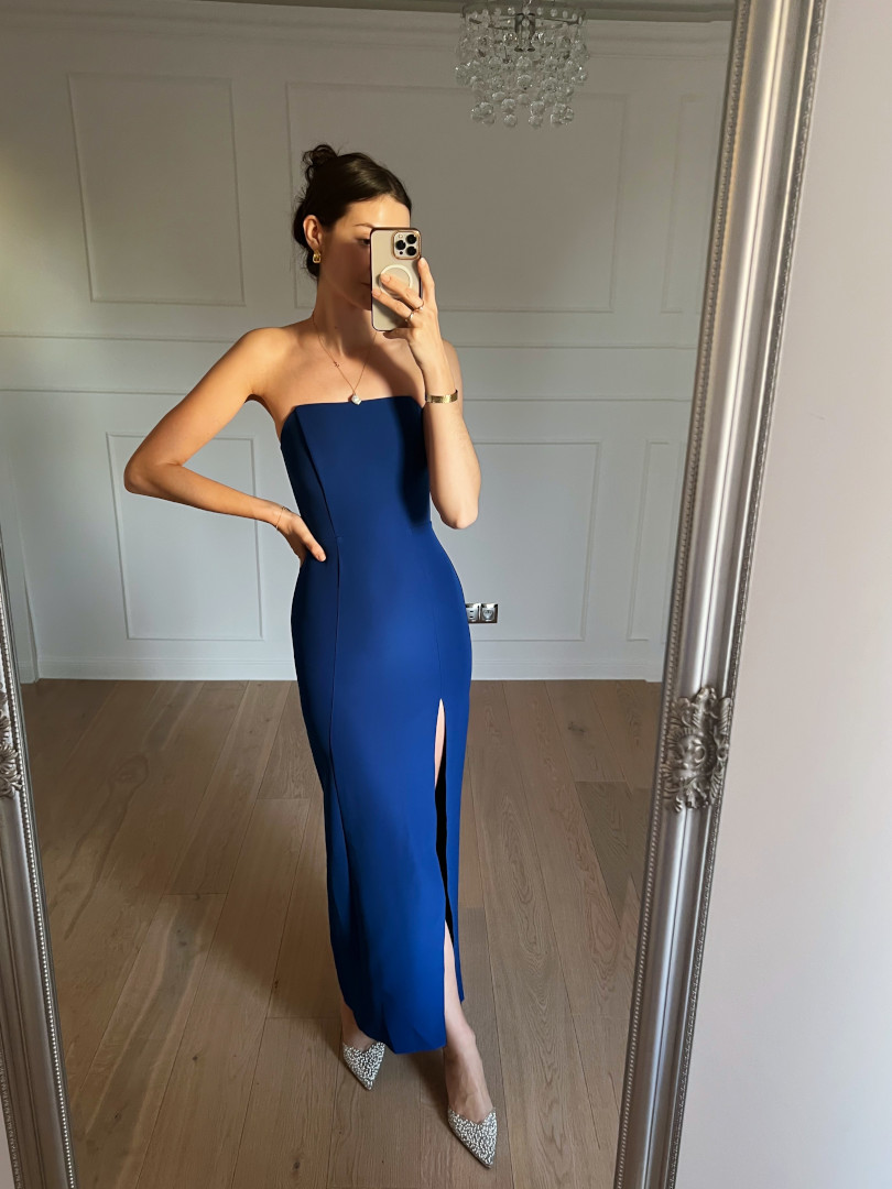 Emily - simple cornflower strapless dress with a spread