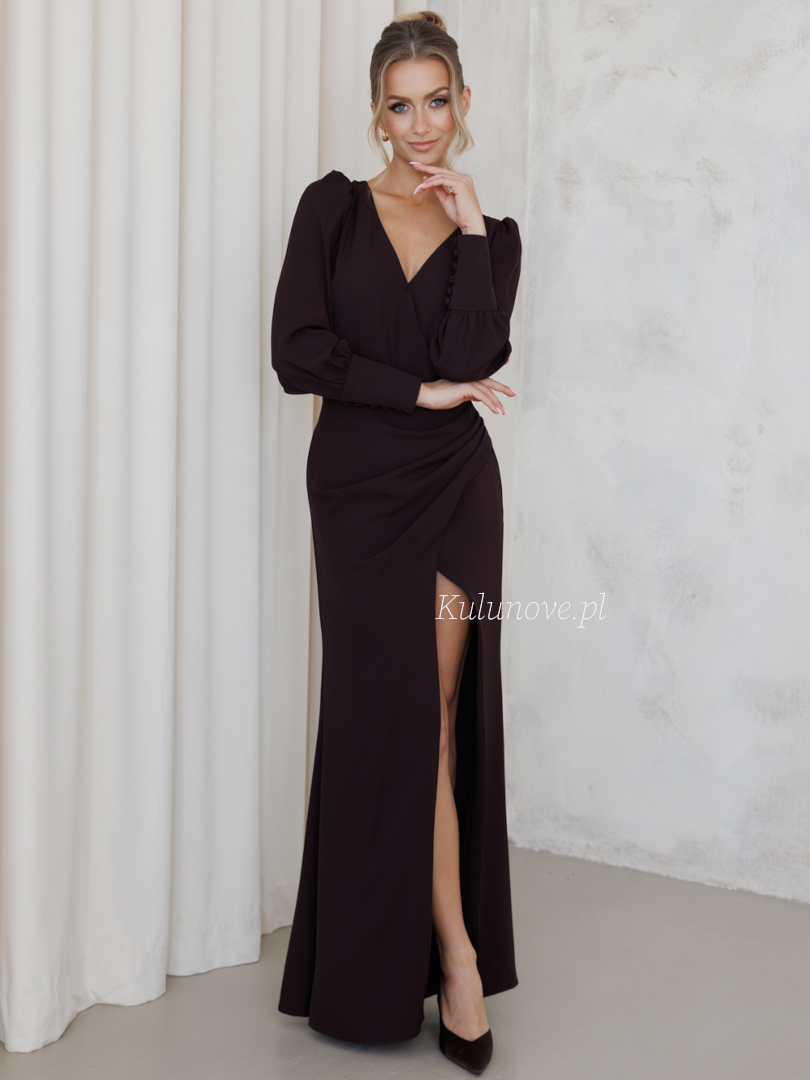 The V-shaped neckline subtly exposes the neck and collarbones, while the long, buff sleeves ending in cuffs with small buttons introduce a romantic touch.