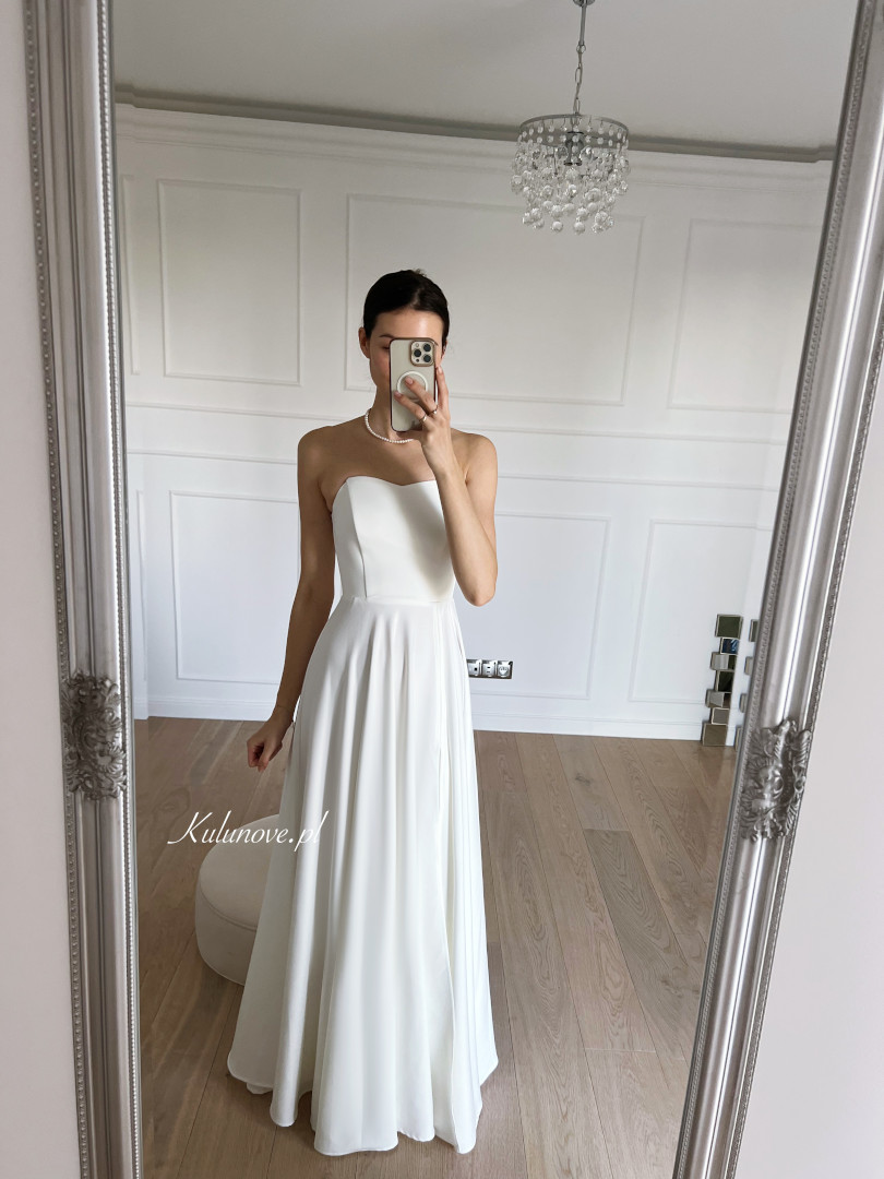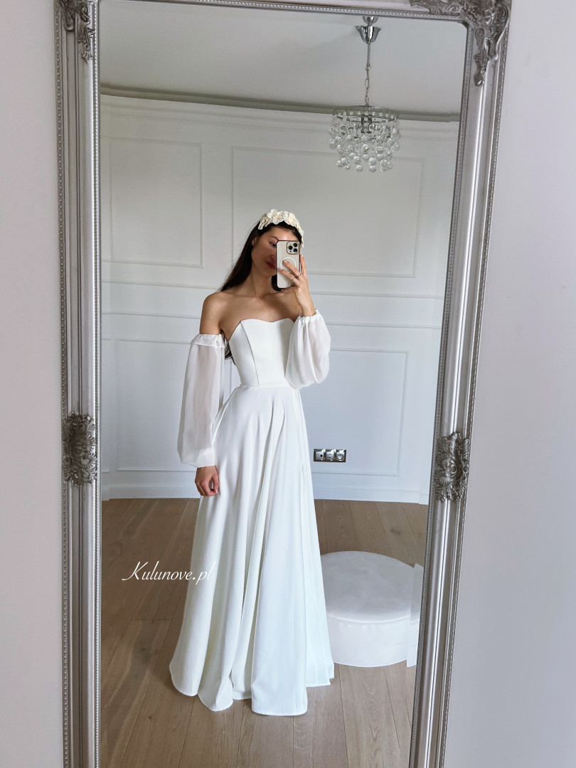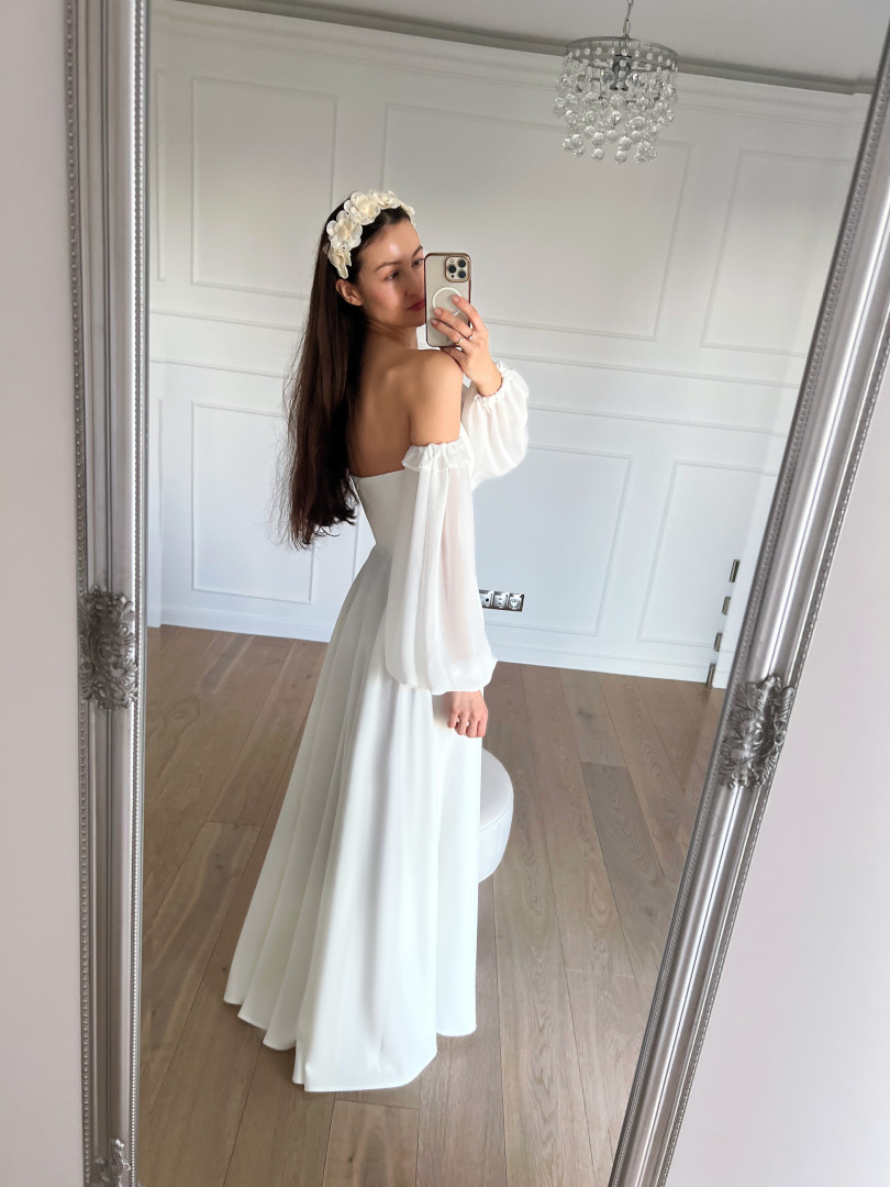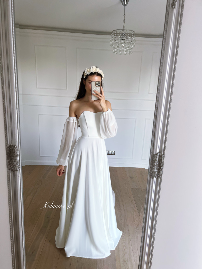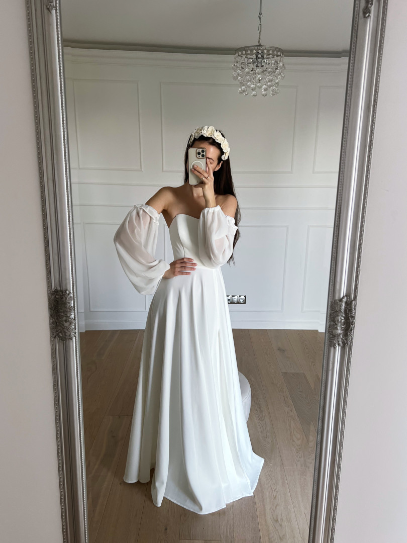 The chiffon sleeves are not sewn on permanently and are decorated at the top with a small frill.