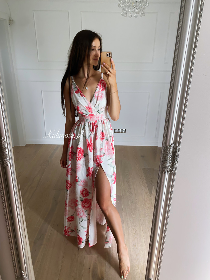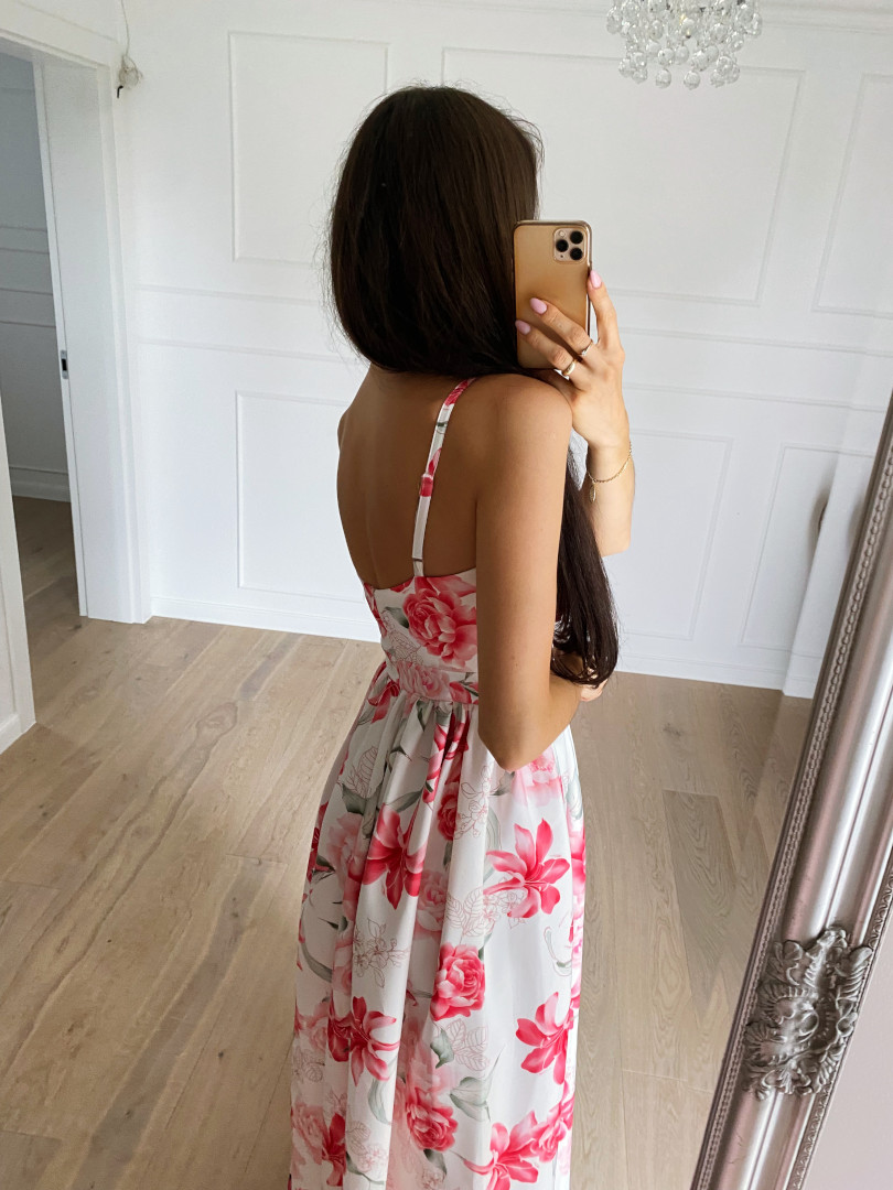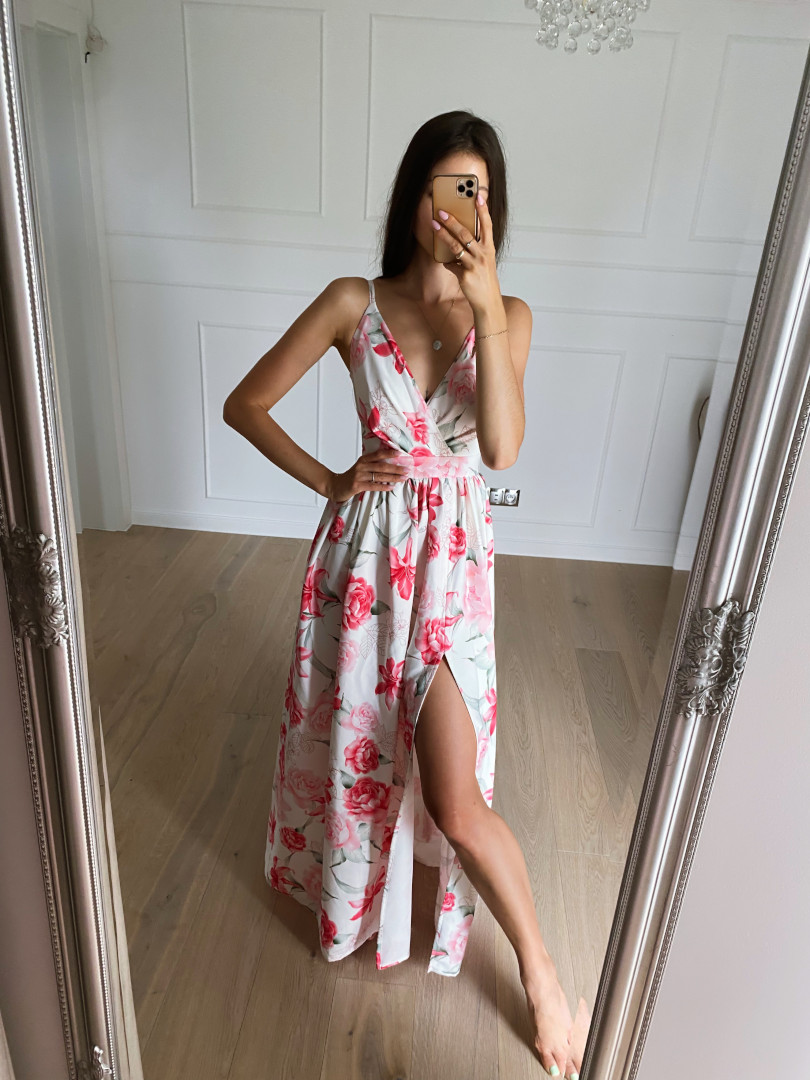 The dress perfectly emphasizes the waist and has a beautiful floral pattern.