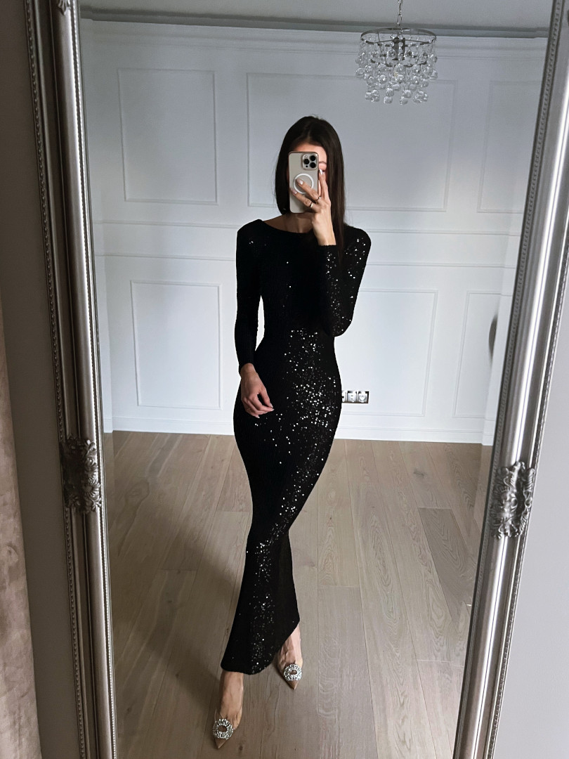 Long dress entirely covered with sequins. The dress is made of elastic material.