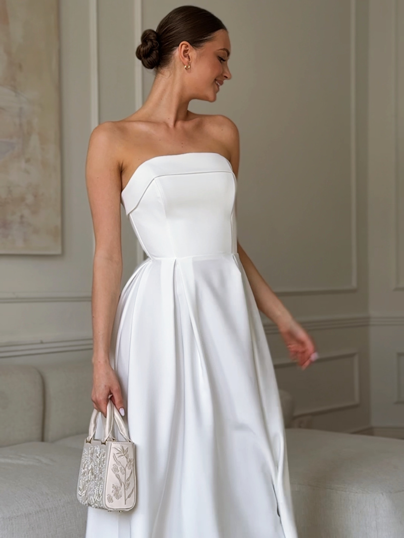 A midi skirt with a slight flare flows from the accentuated waist, whose perfectly planned pleats add volume while keeping it light.