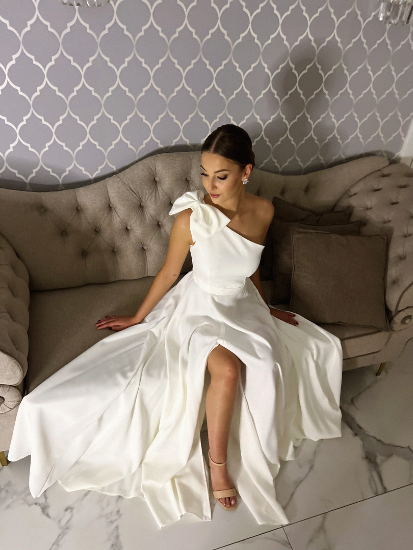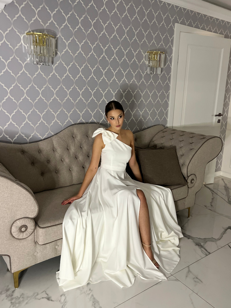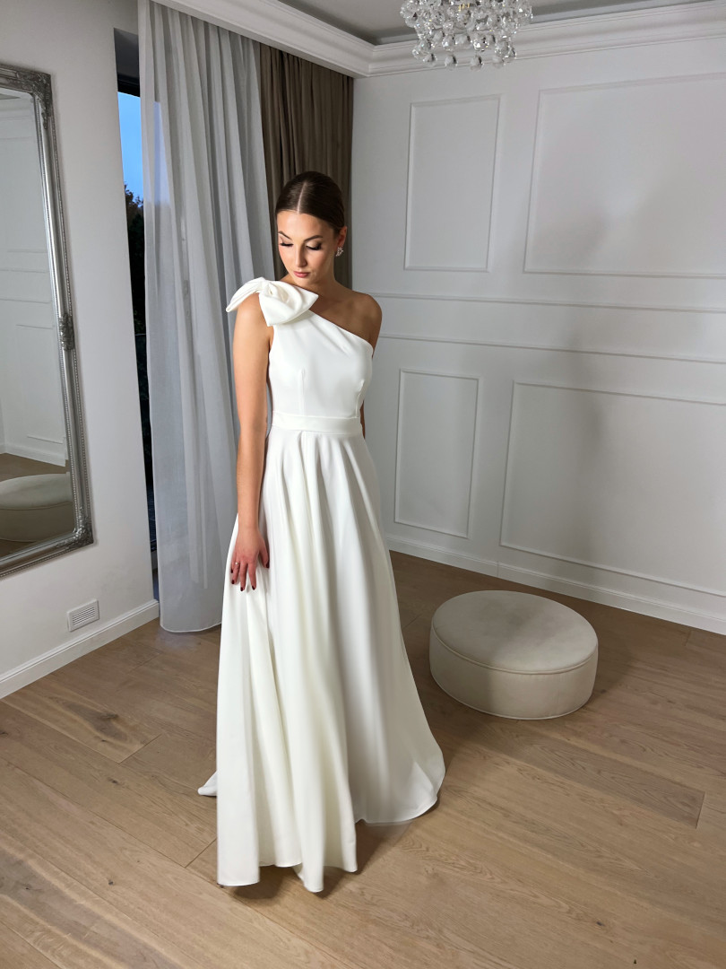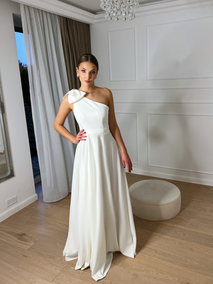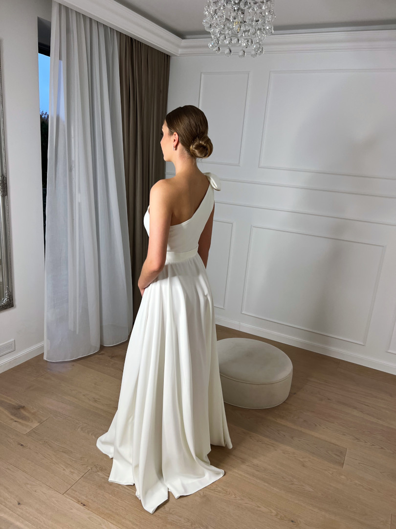The creation has an A-line cut, it widens from the waist down, so it optically slims the silhouette and gives lightness.