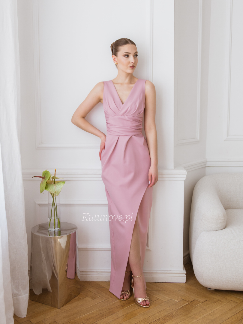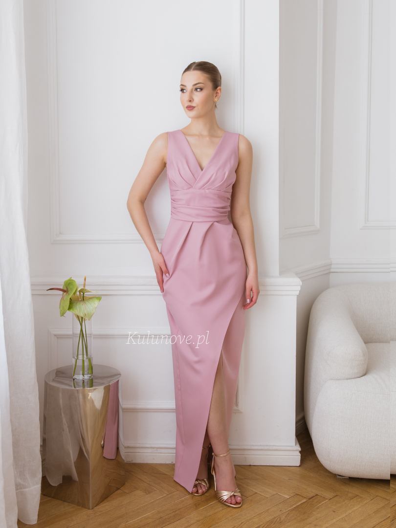 The maxi length, combined with a high front slit, adds lightness and a modern touch, while optically elongating the legs.